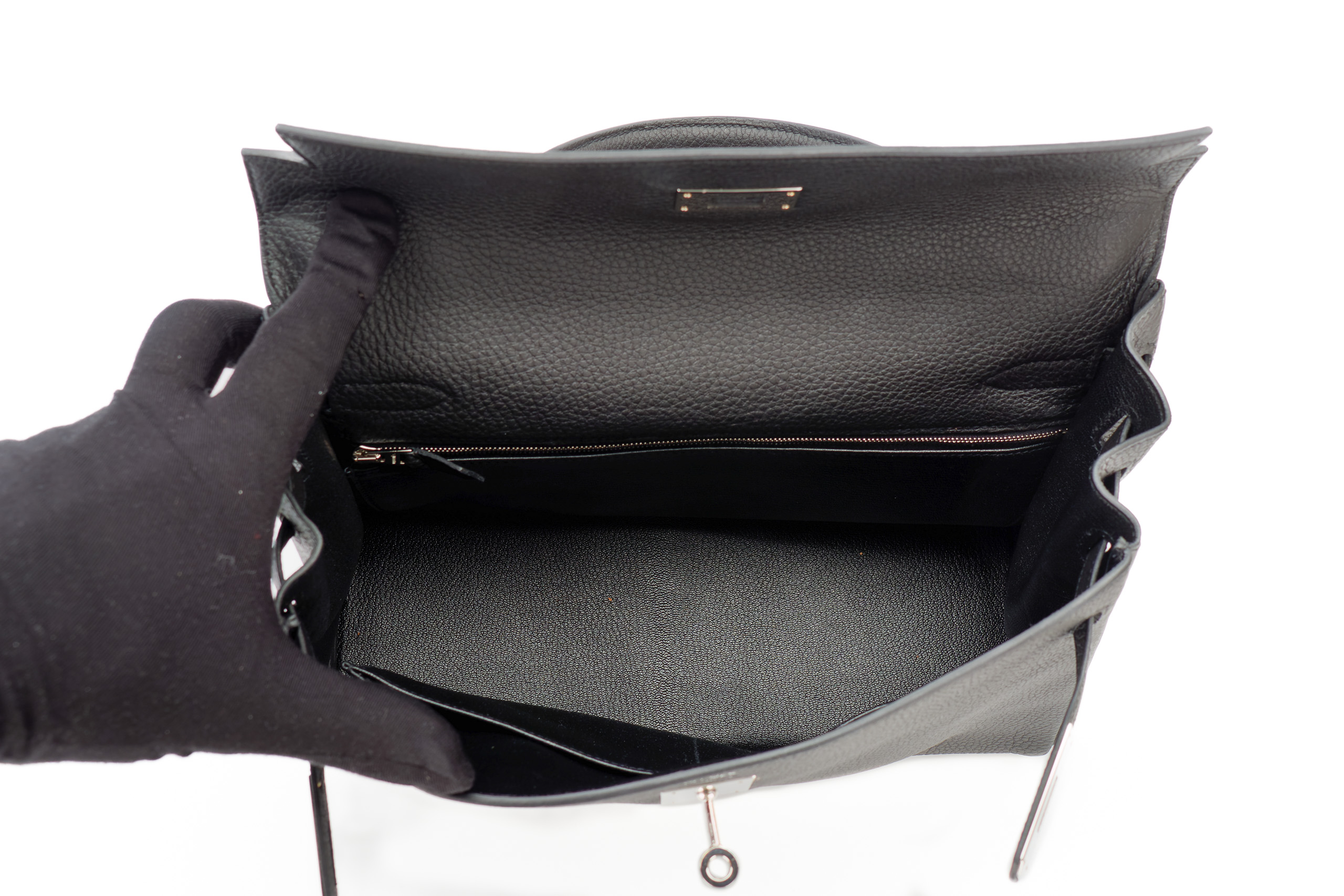 Hermès Kelly 32 Noir / Black Togo Palladium Hardware / T Stamp 2015, Preloved Full set with the receipt