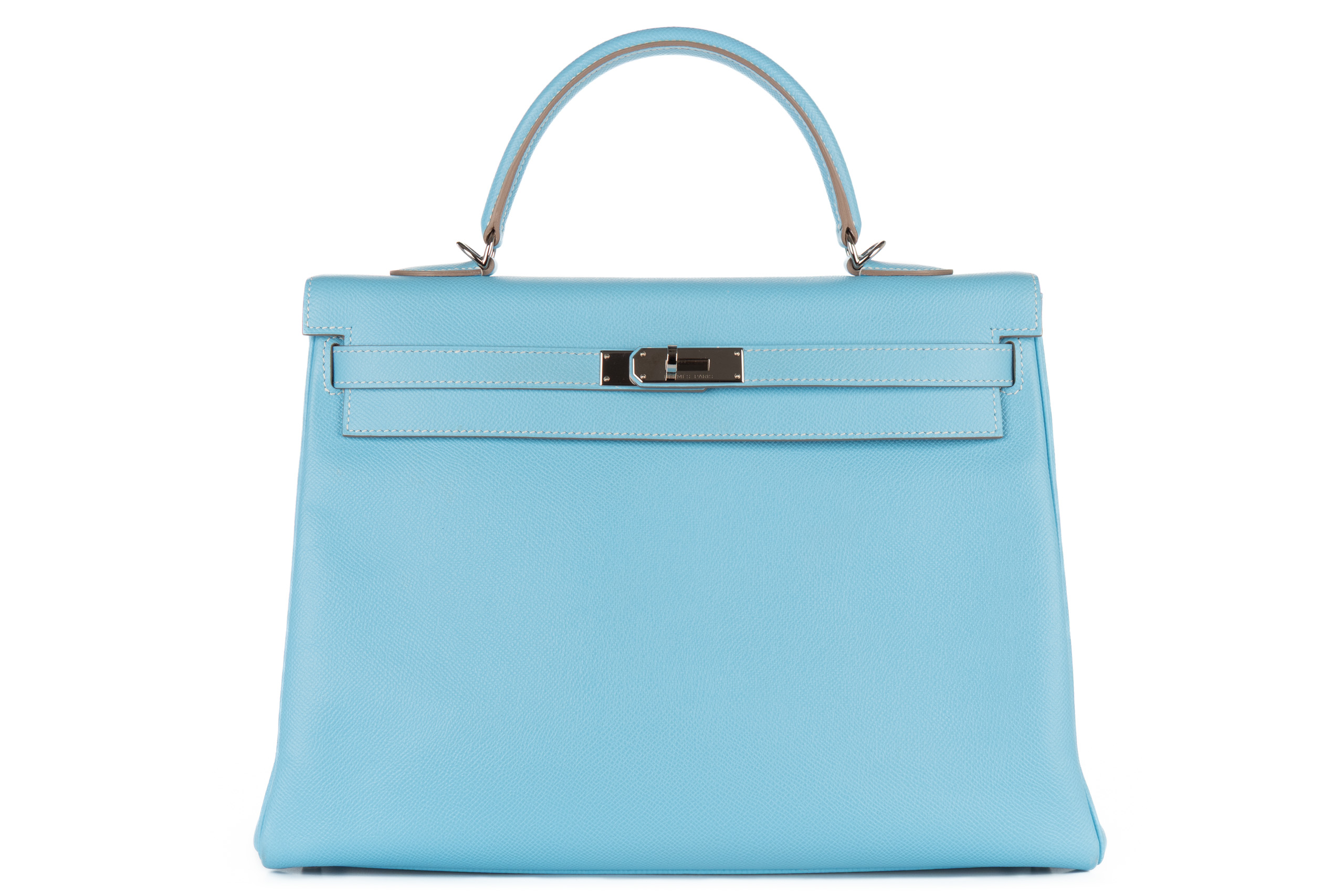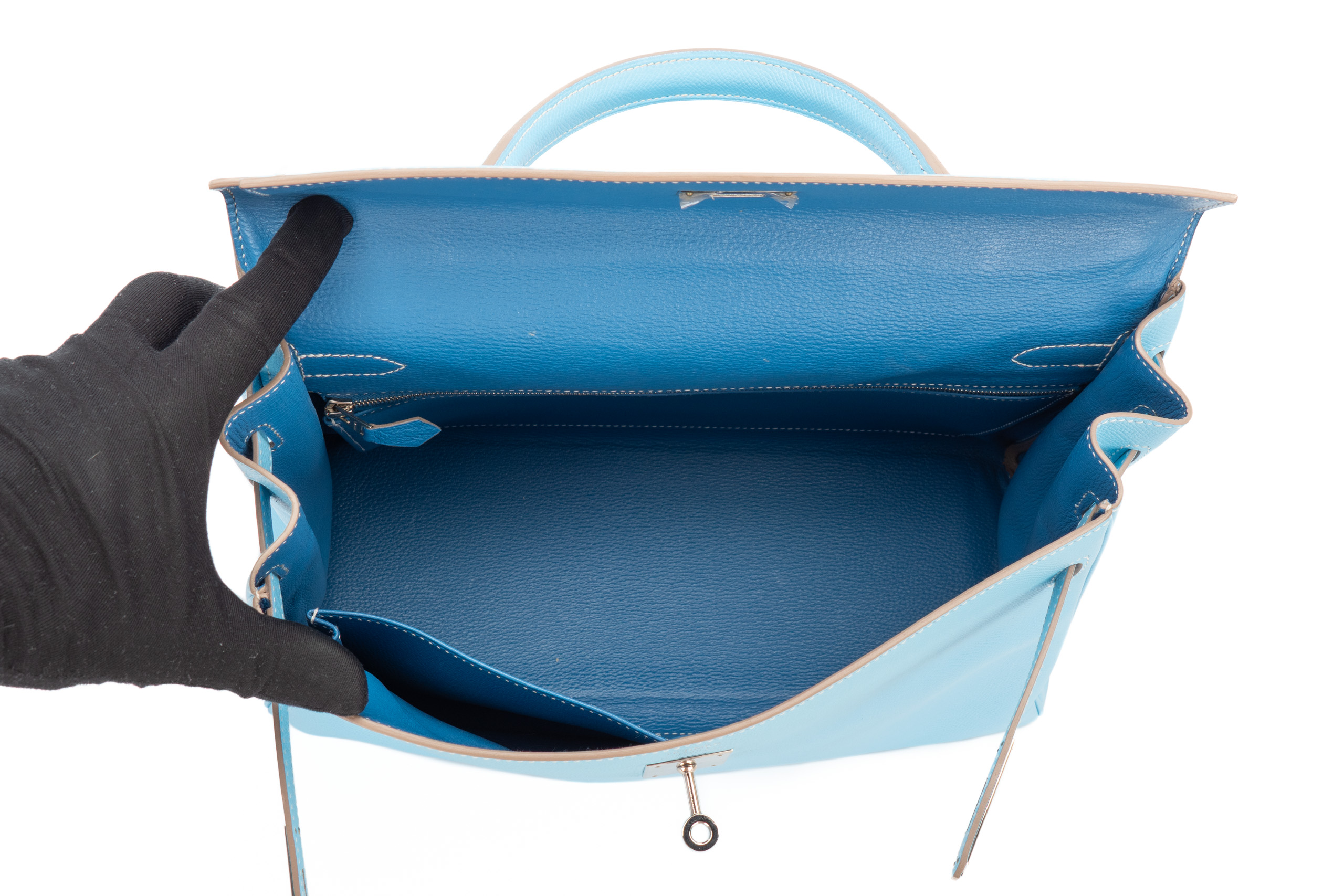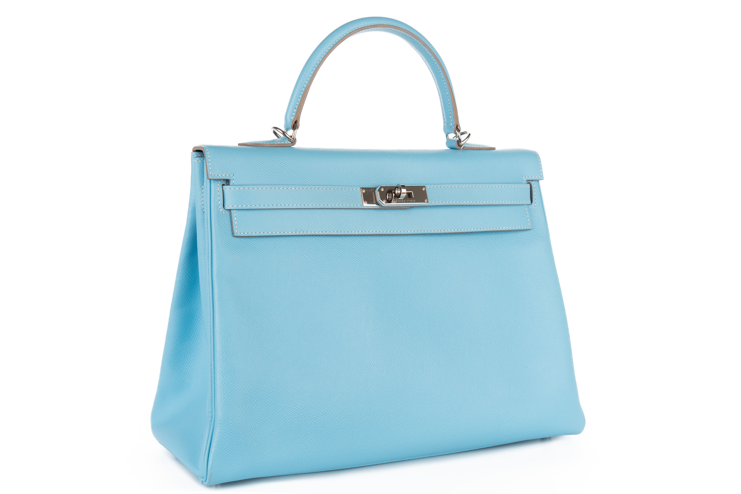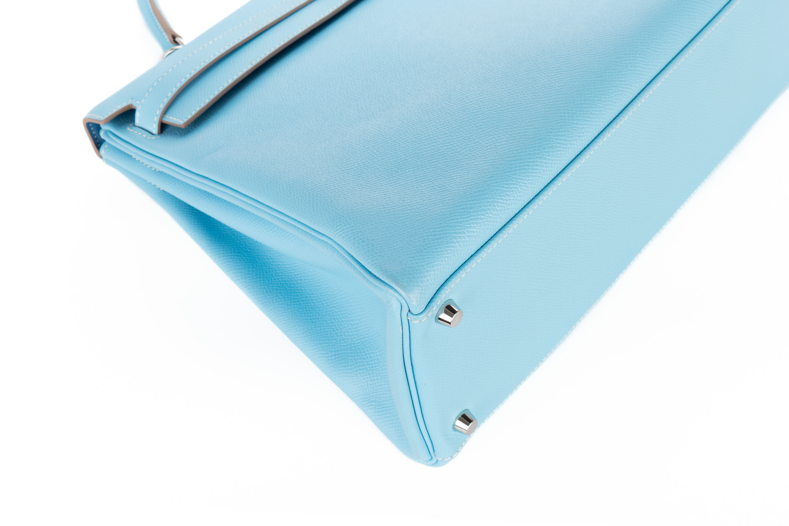 Hermès Kelly 35 Candy Collection Bleu Celeste / Bleu Mykonos Epsom Retourne Palladium Hardware / O Circle Stamp 2011, Excellent Preloved