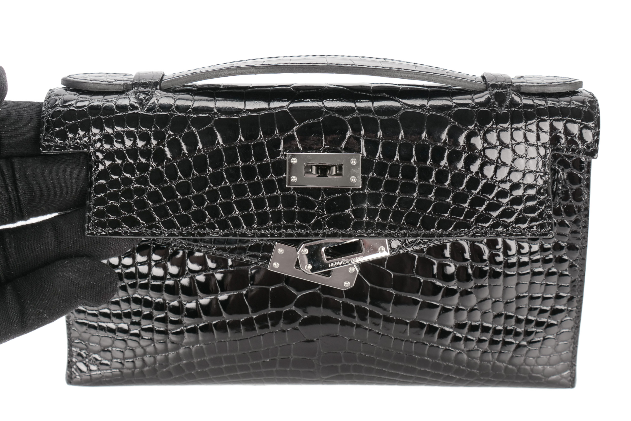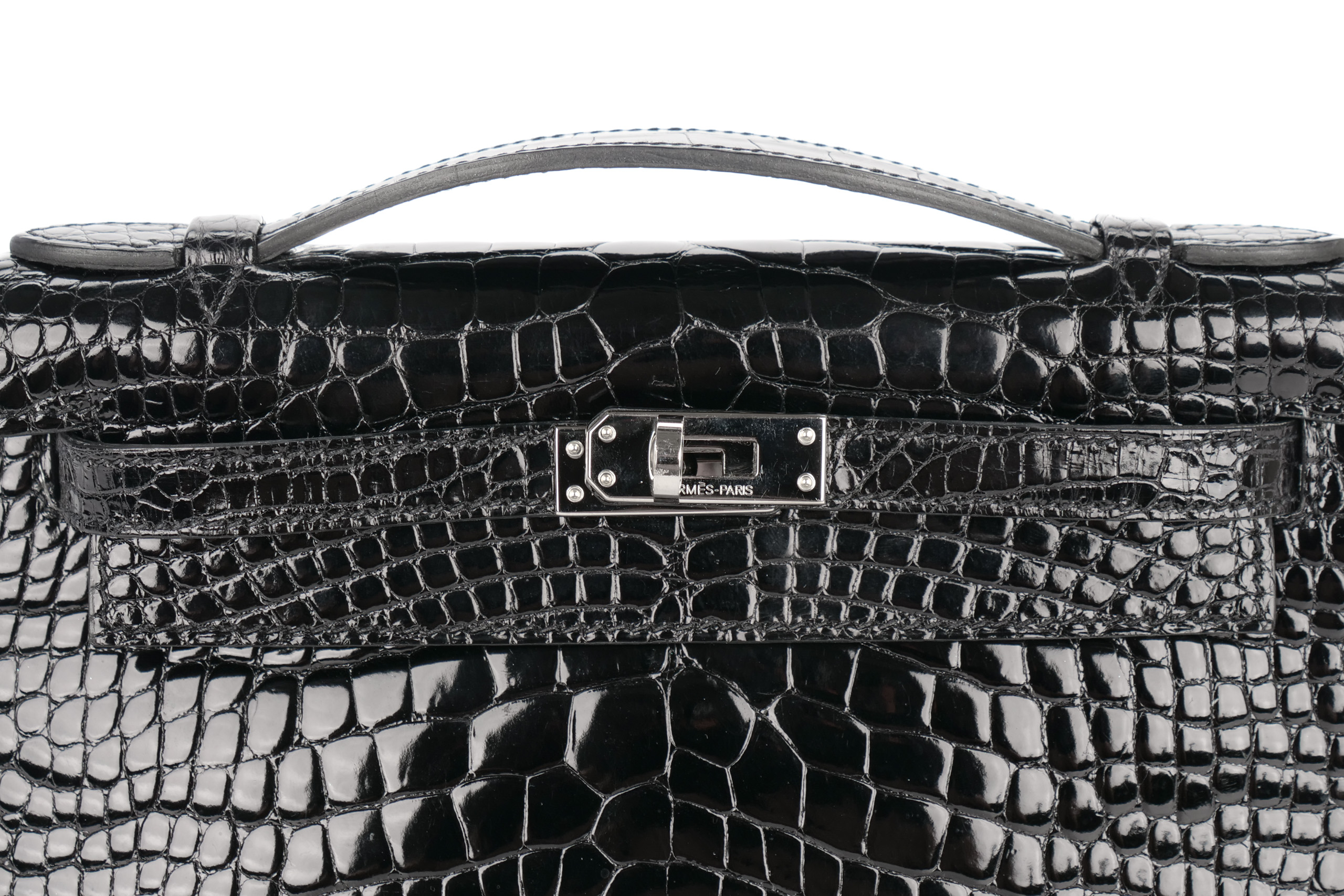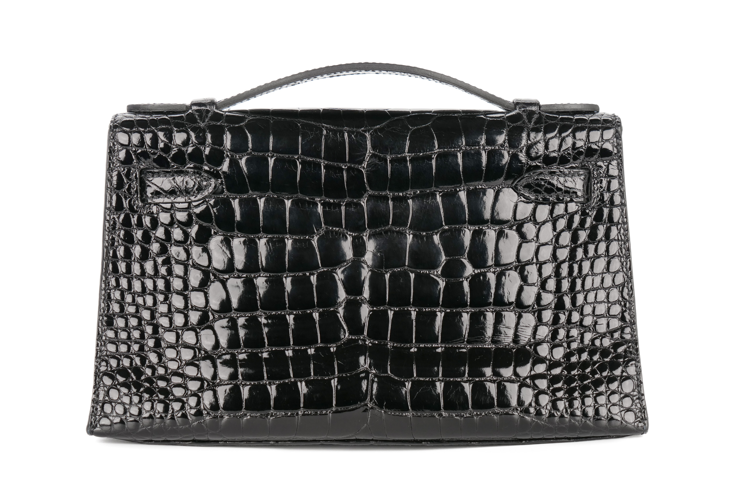 Hermès Kelly Pochette Noir / Black Shiny Aligator Palladium Hardware / M Square Stamp 2009, Excellent Preloved