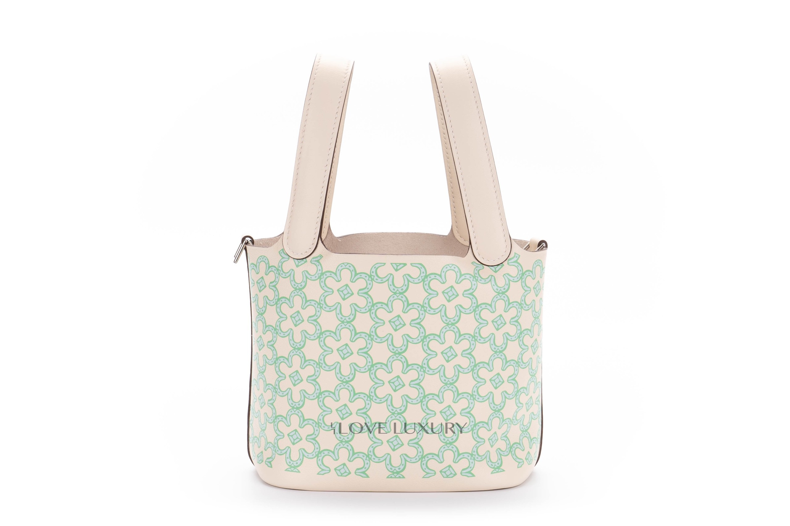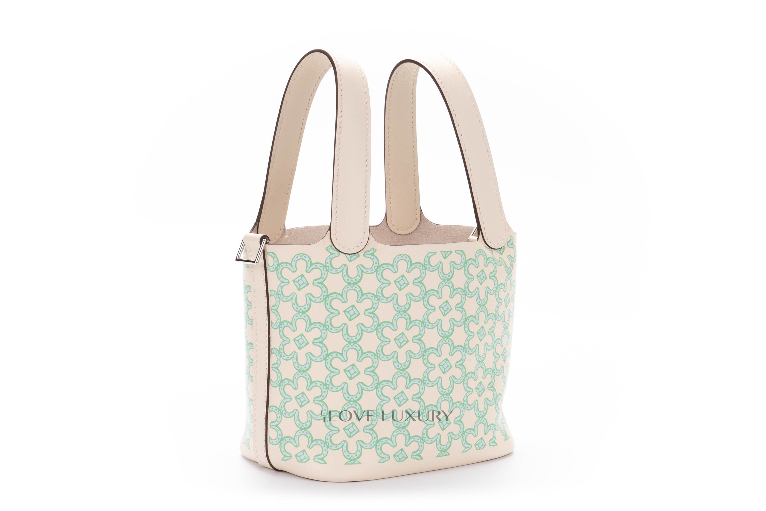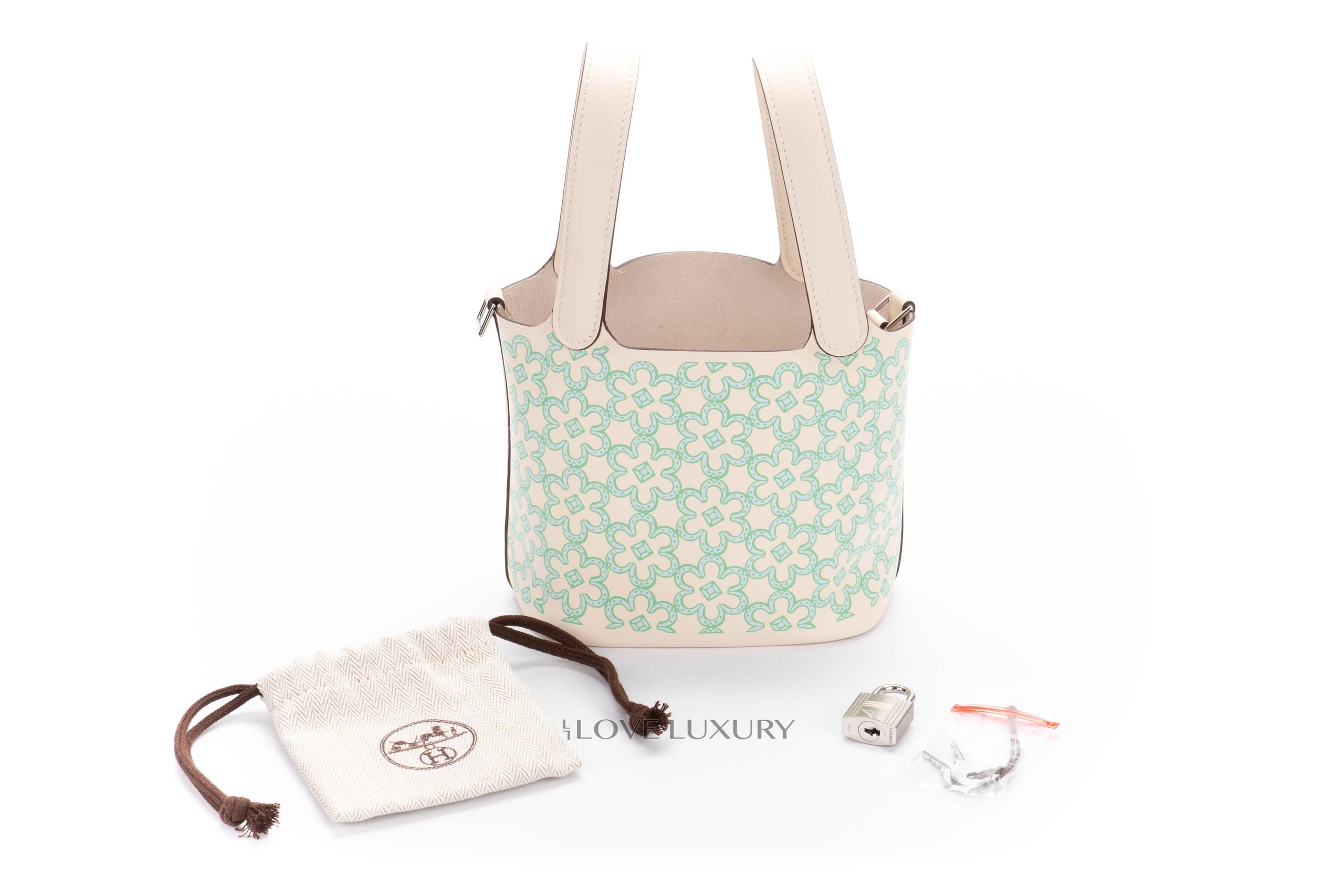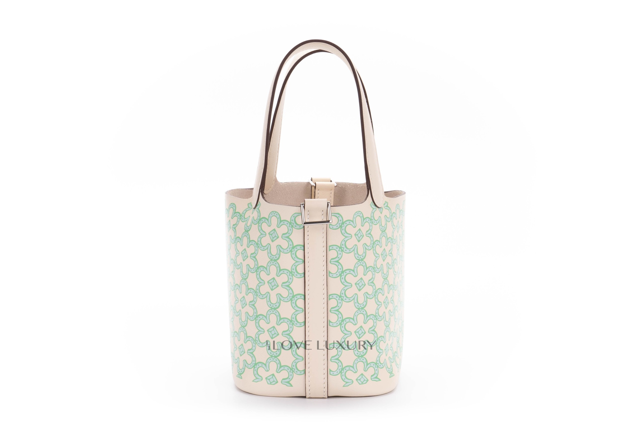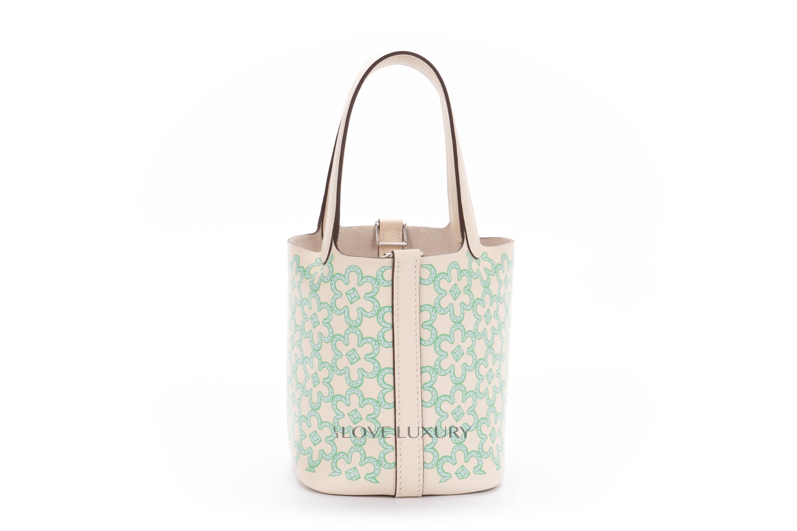 The micro Picotin is a lovely statement piece to hold. This particular model is a limited edition and is named Lucky Daisy. This limited edition model in 2 colour ways, pink and green. We at Love Luxury are lucky enough to have the this green model in store and available to purchase. The bag is locked with the classic Hermès Padlock and keys which in this instance is palladium. This bag is box fresh and comes to you as a full set.
