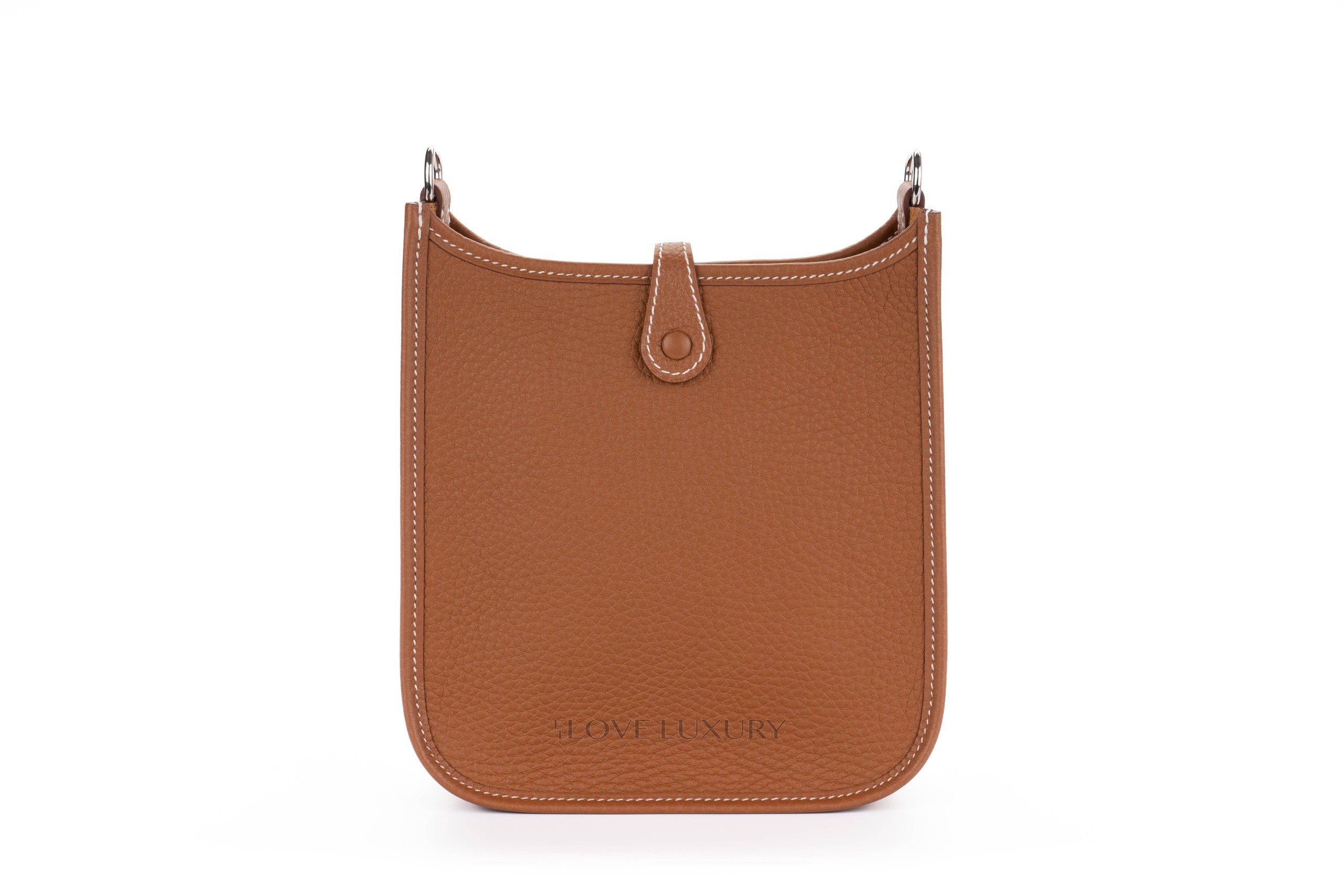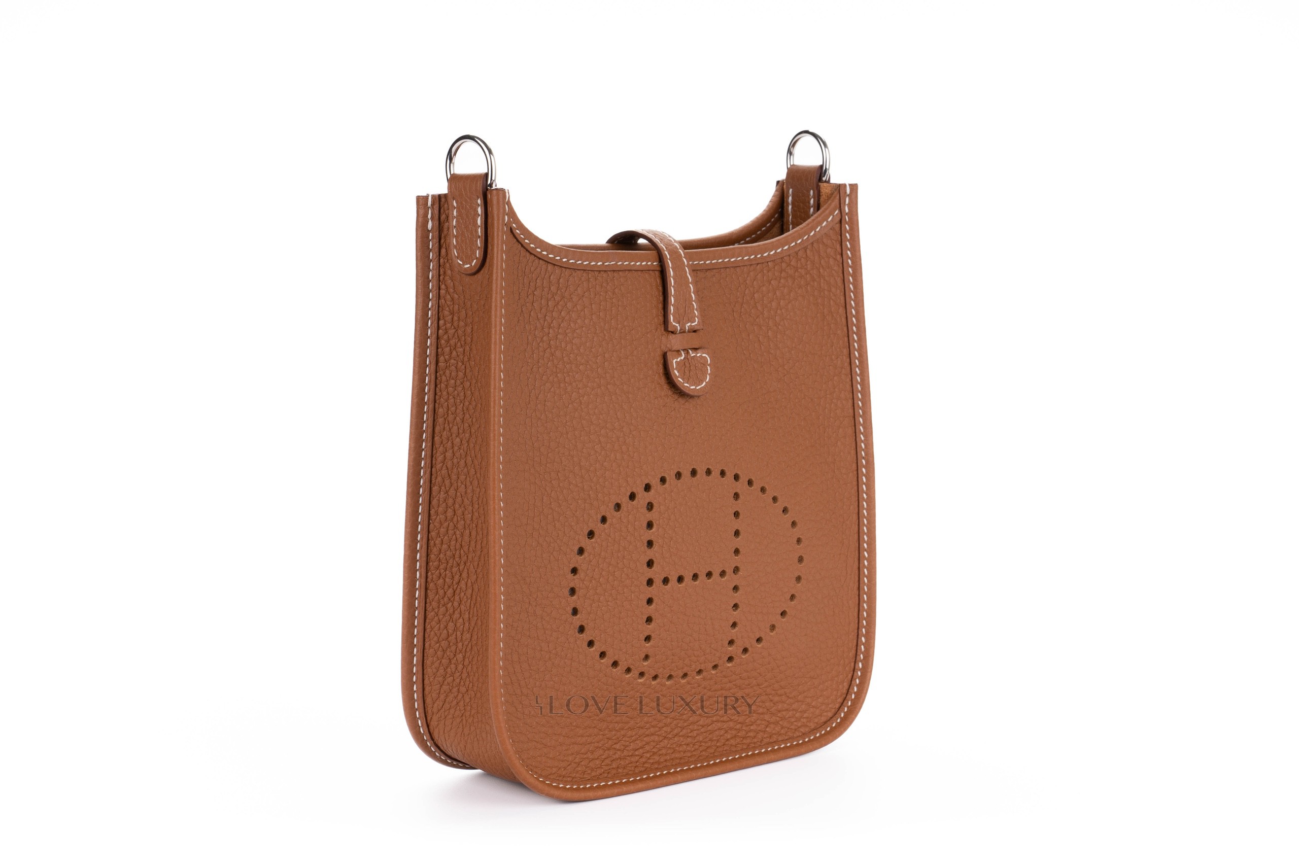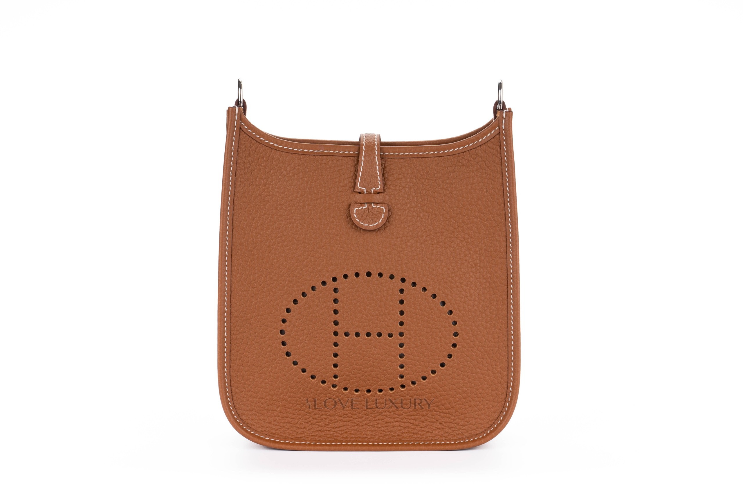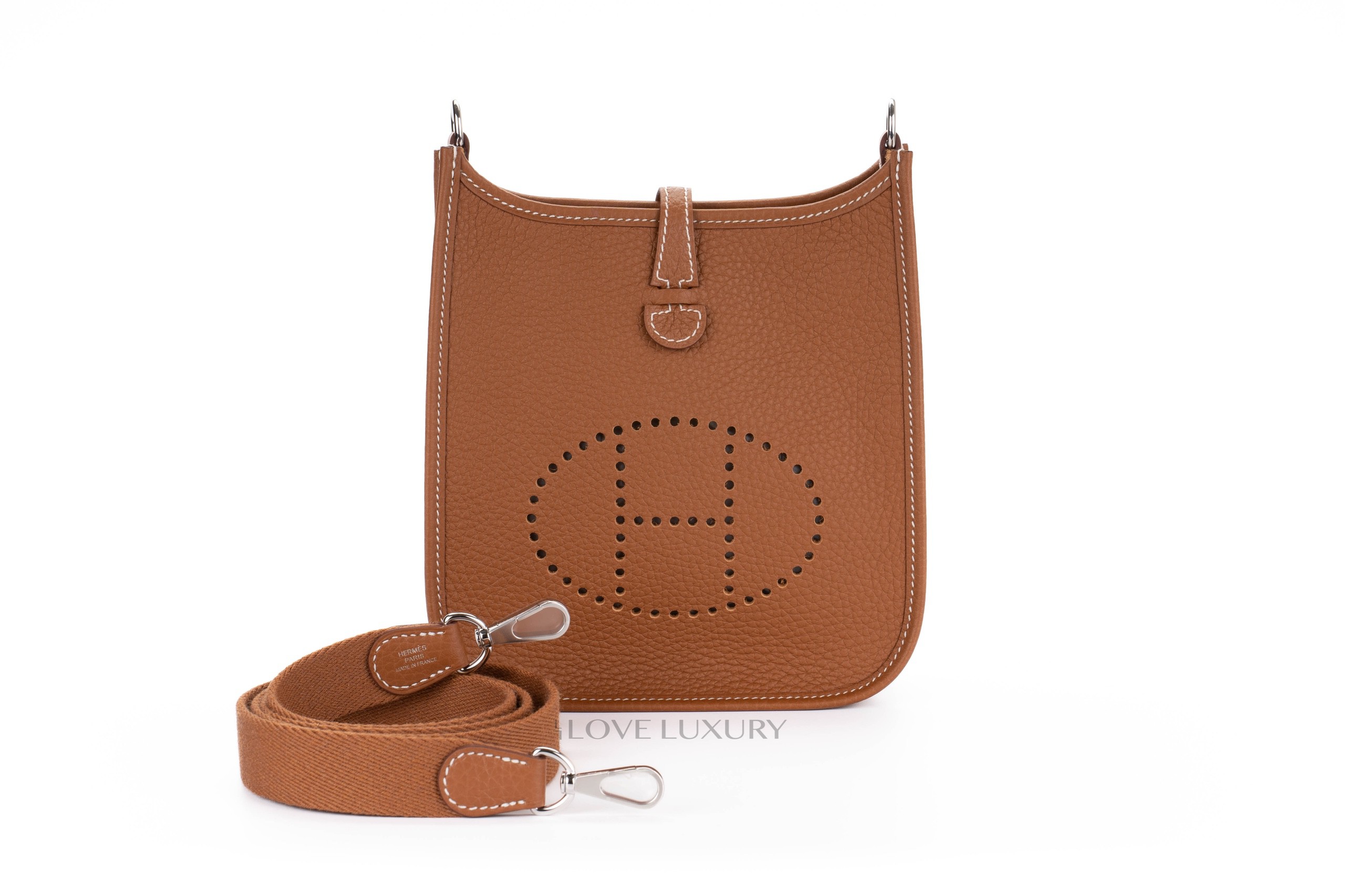 A mini Evelyne 16 or TPM as it is also known, with its perforated H is the smallest of the Evelyne line. This bag can fit your basic everyday essentials and is secured shut with a closure tab and snap popper. Each Evelyne comes with a detachable single strap which can be interchanged between bags, should you have a little collection. The Gold colour is one of the most sought after Hermès color ways with Palladium hardware. This bag is box fresh.