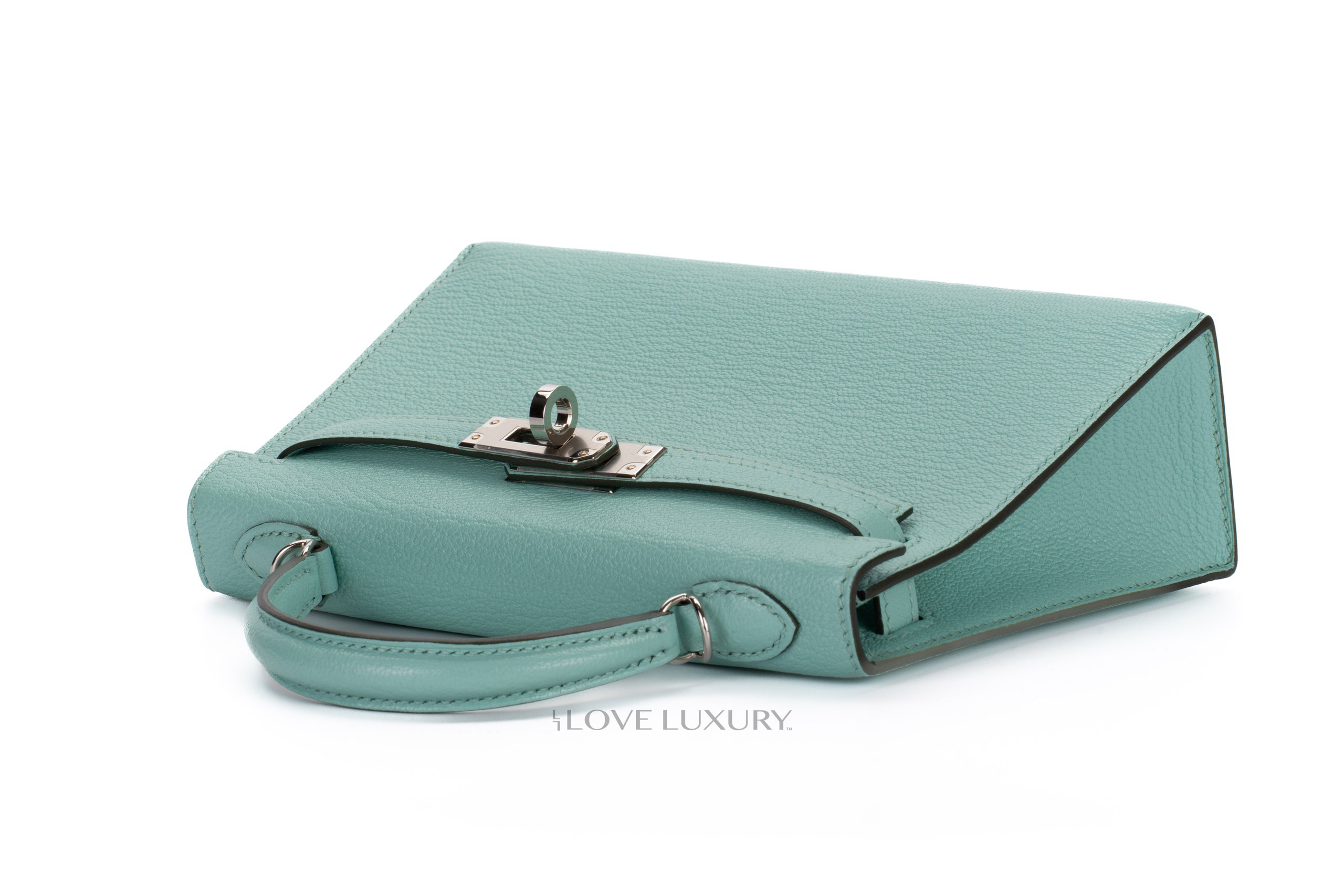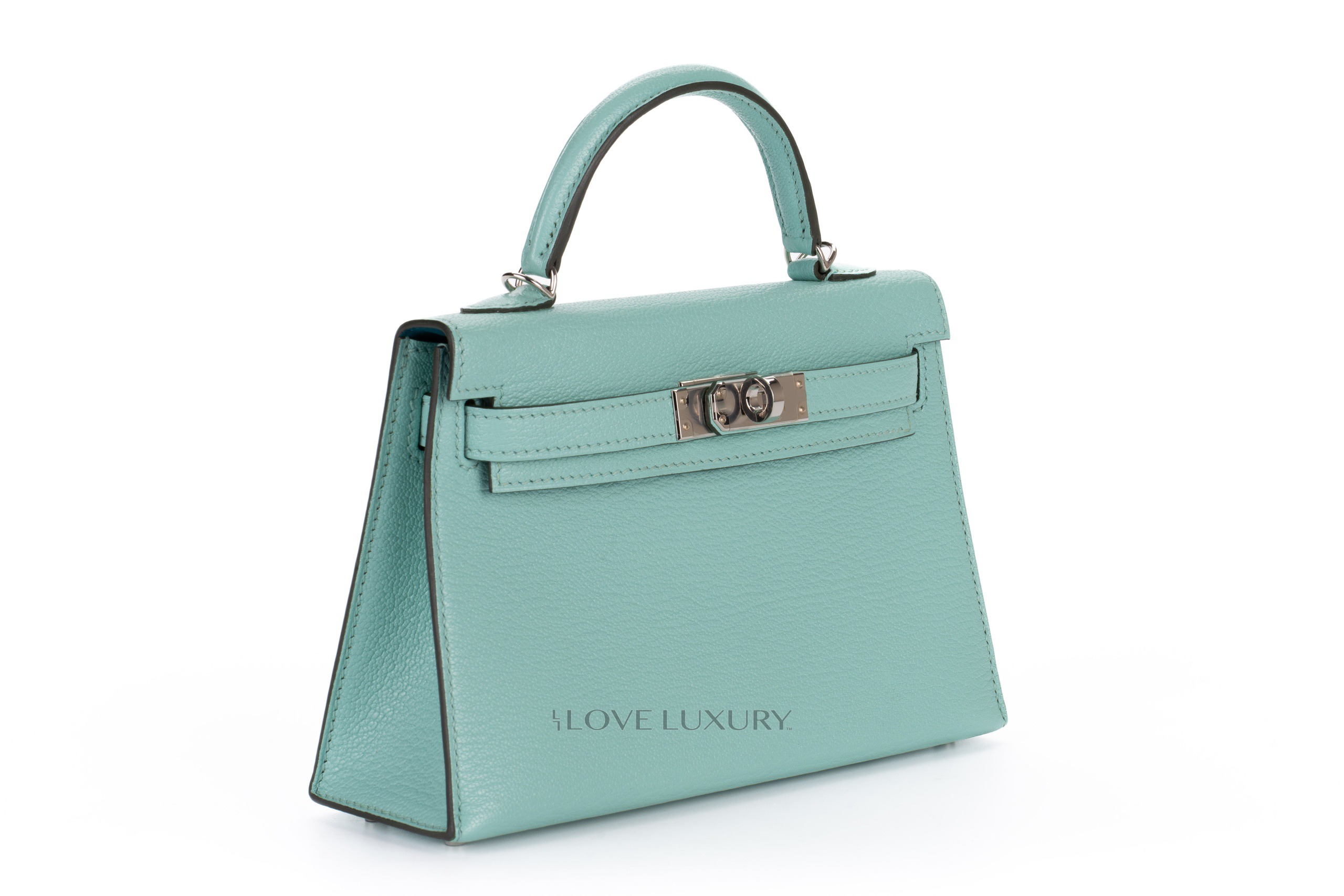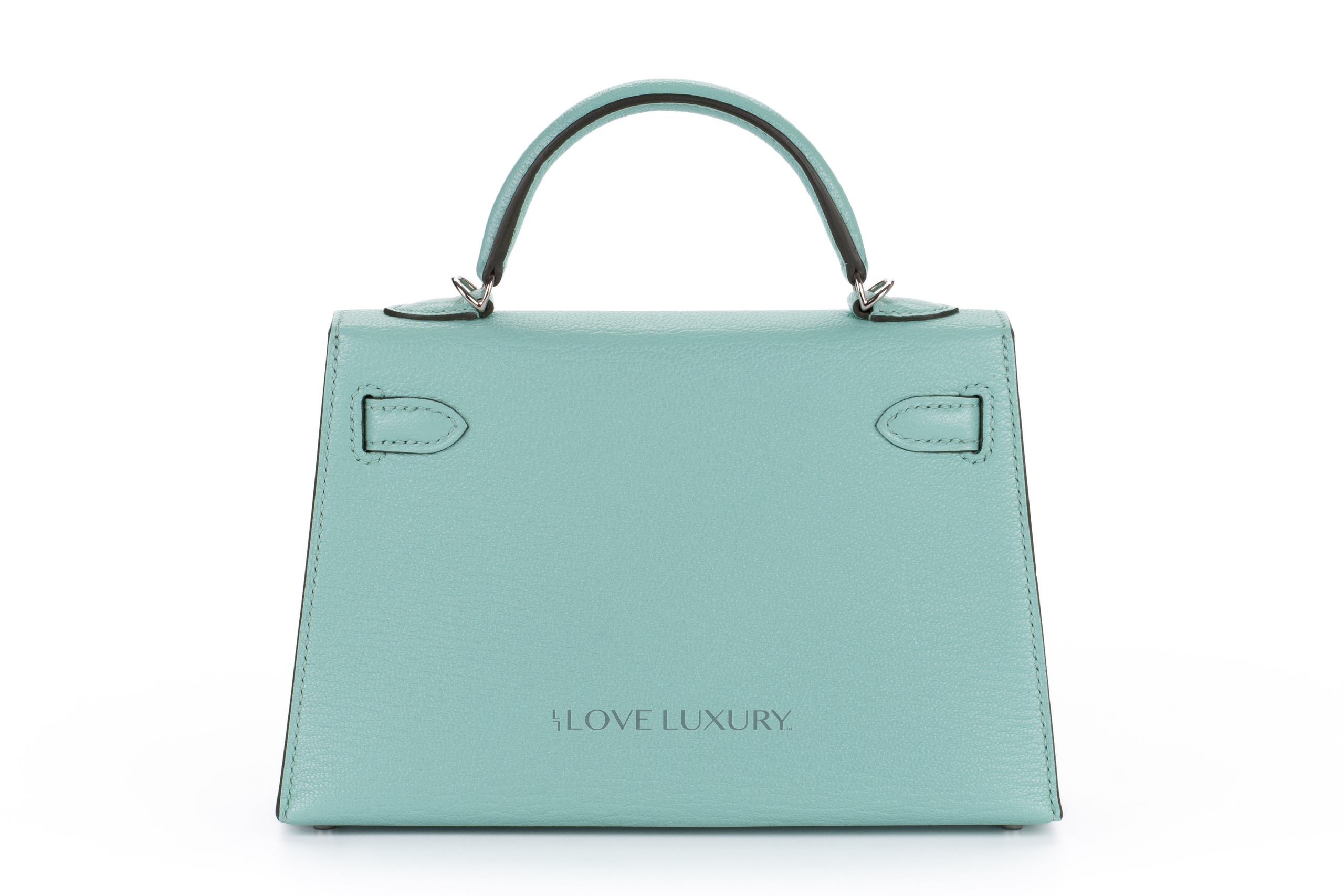 This stunning new arrival here at Love Luxury, a Mini Kelly in the coloe Aqua on a Chevre Mysore leather with a Verso Cobalt Swift interior. The combination of these two colors complemented with Palladium hardware, makes it a perfect summer bag. This bag comes as a full set including a copy of receip, its in a box fresh condition.