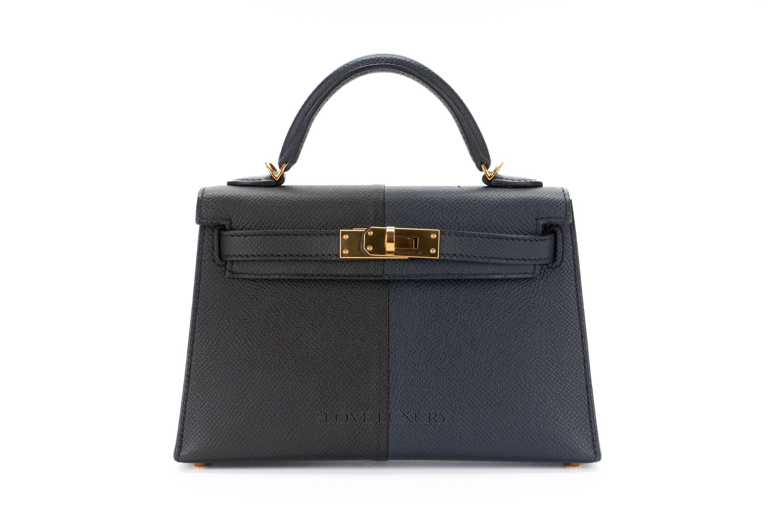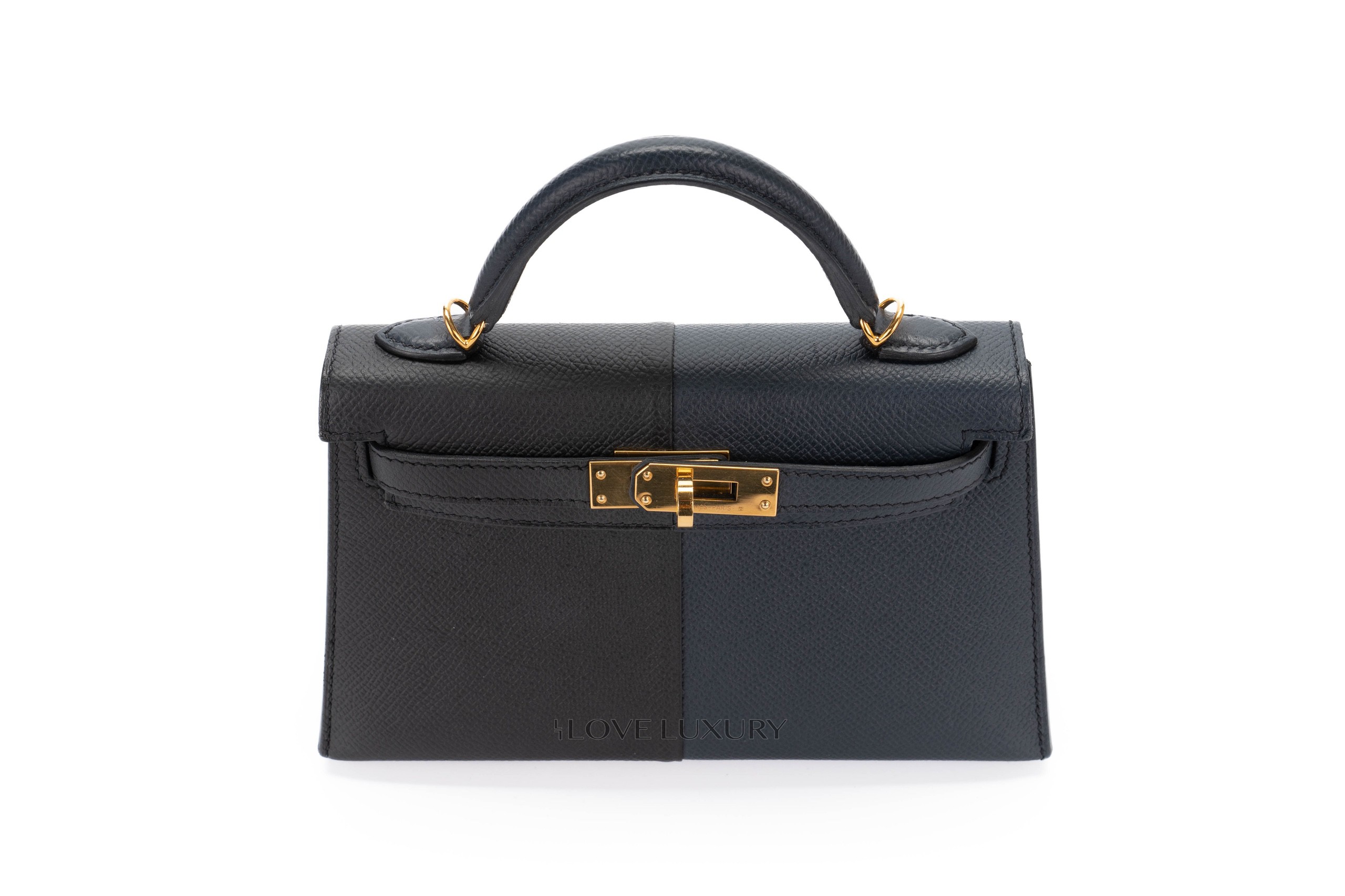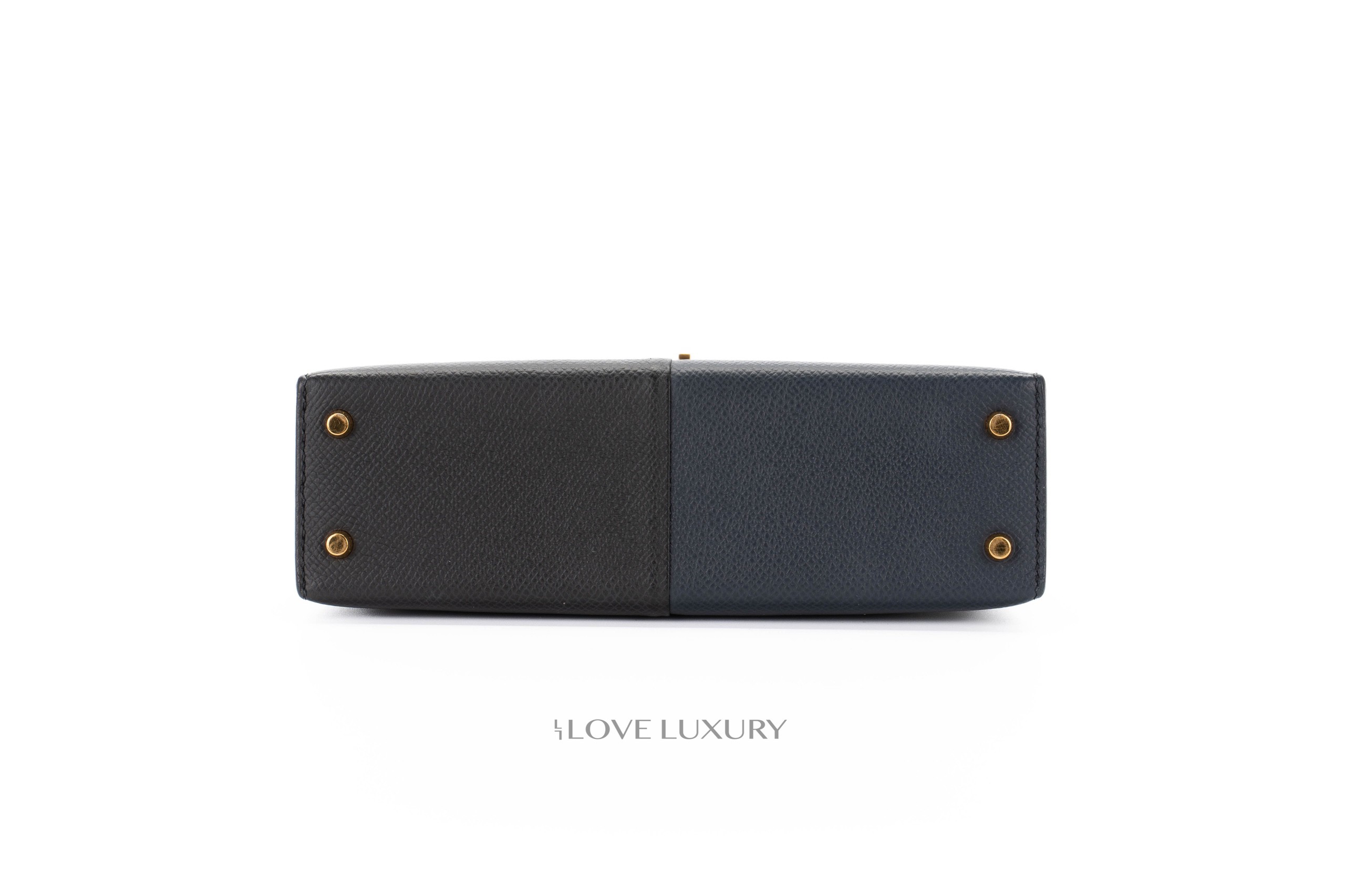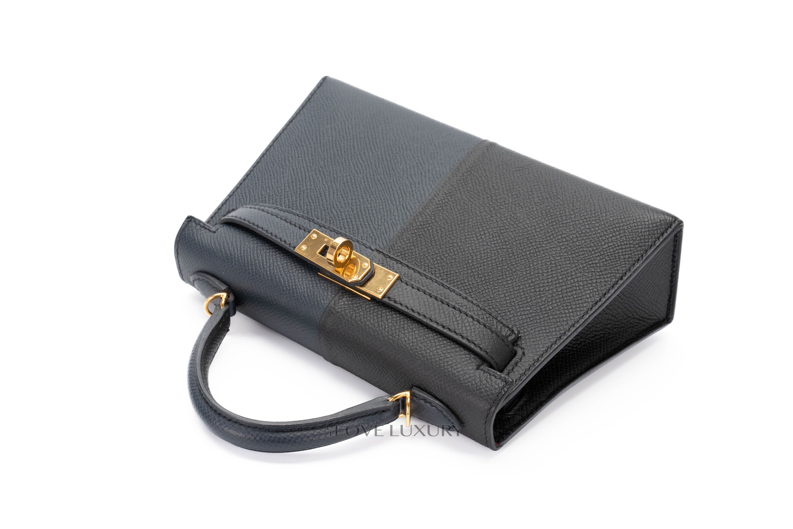 Hermès Mini Kelly Casaque Epsom Blue Indigo / Black Verso Rouge Grenat Gold Hardware / Z stamp 2021 Excellent Pre-Loved condition.