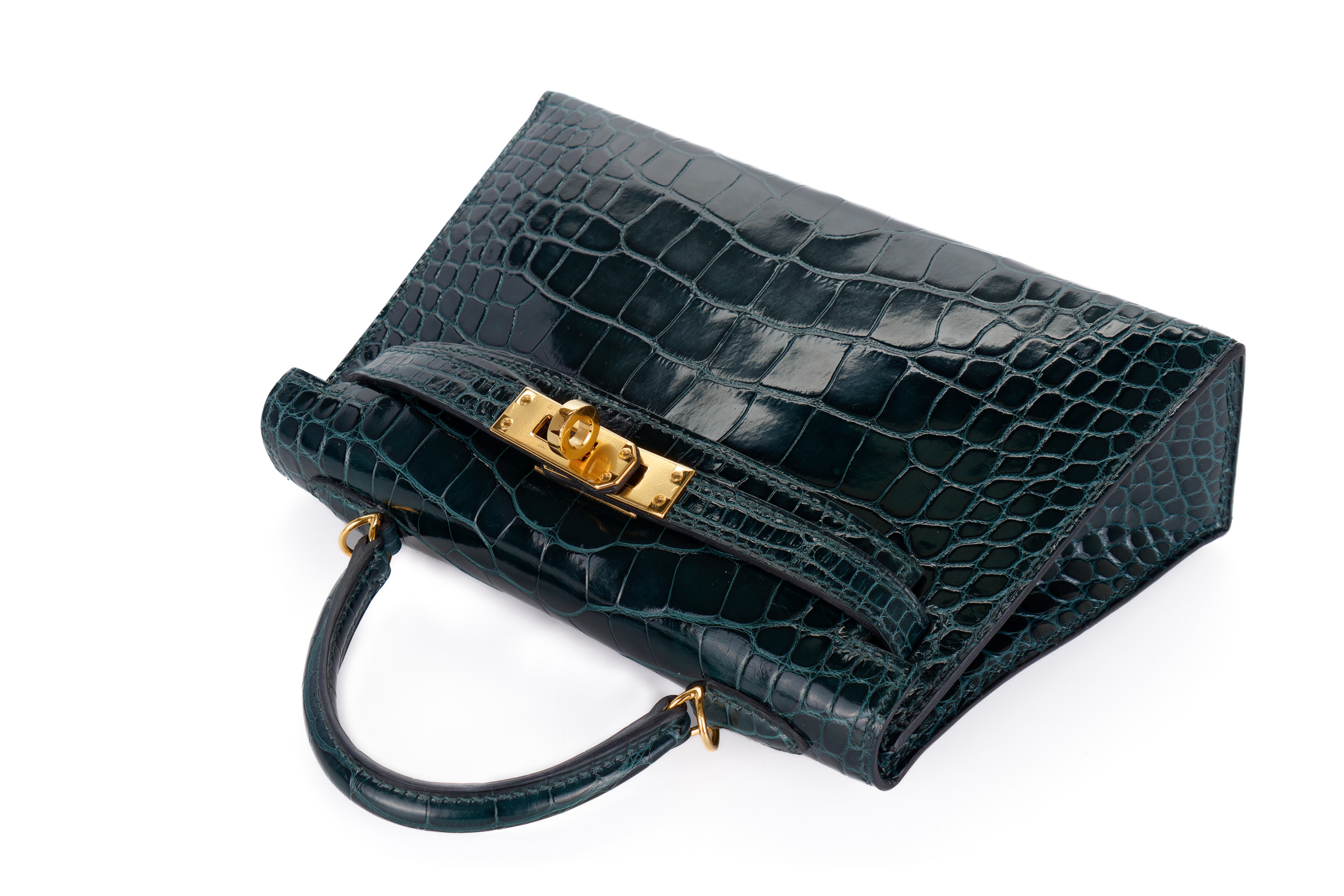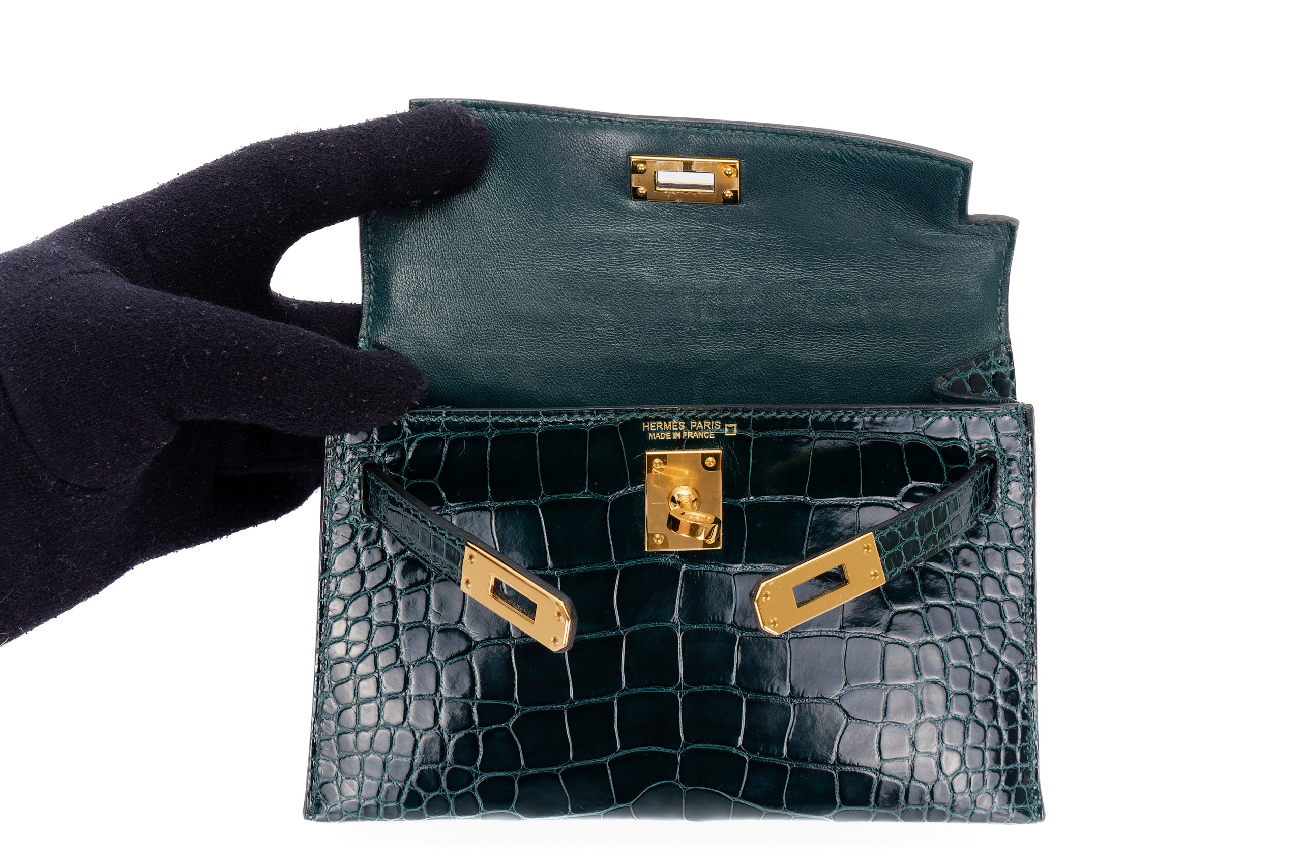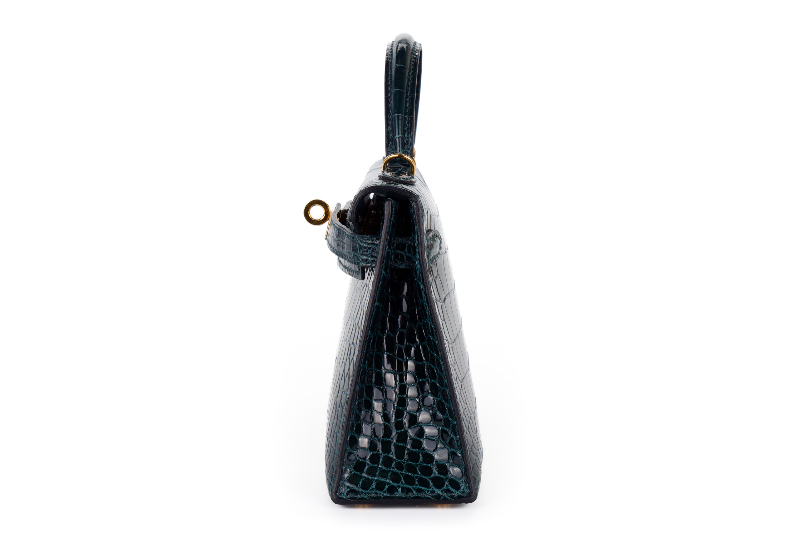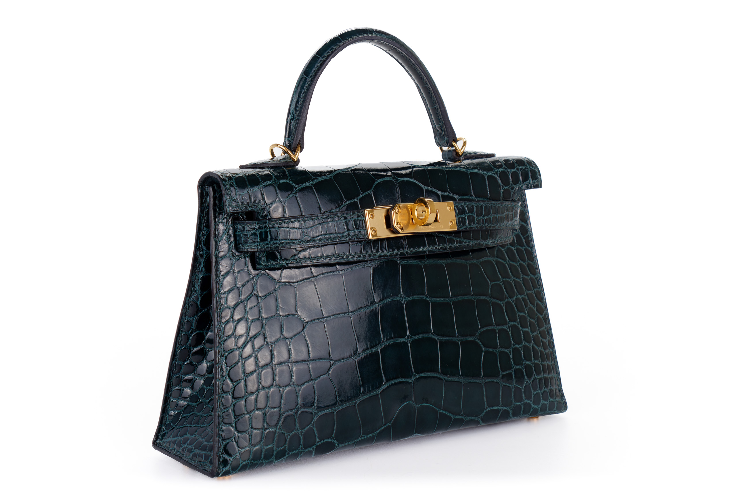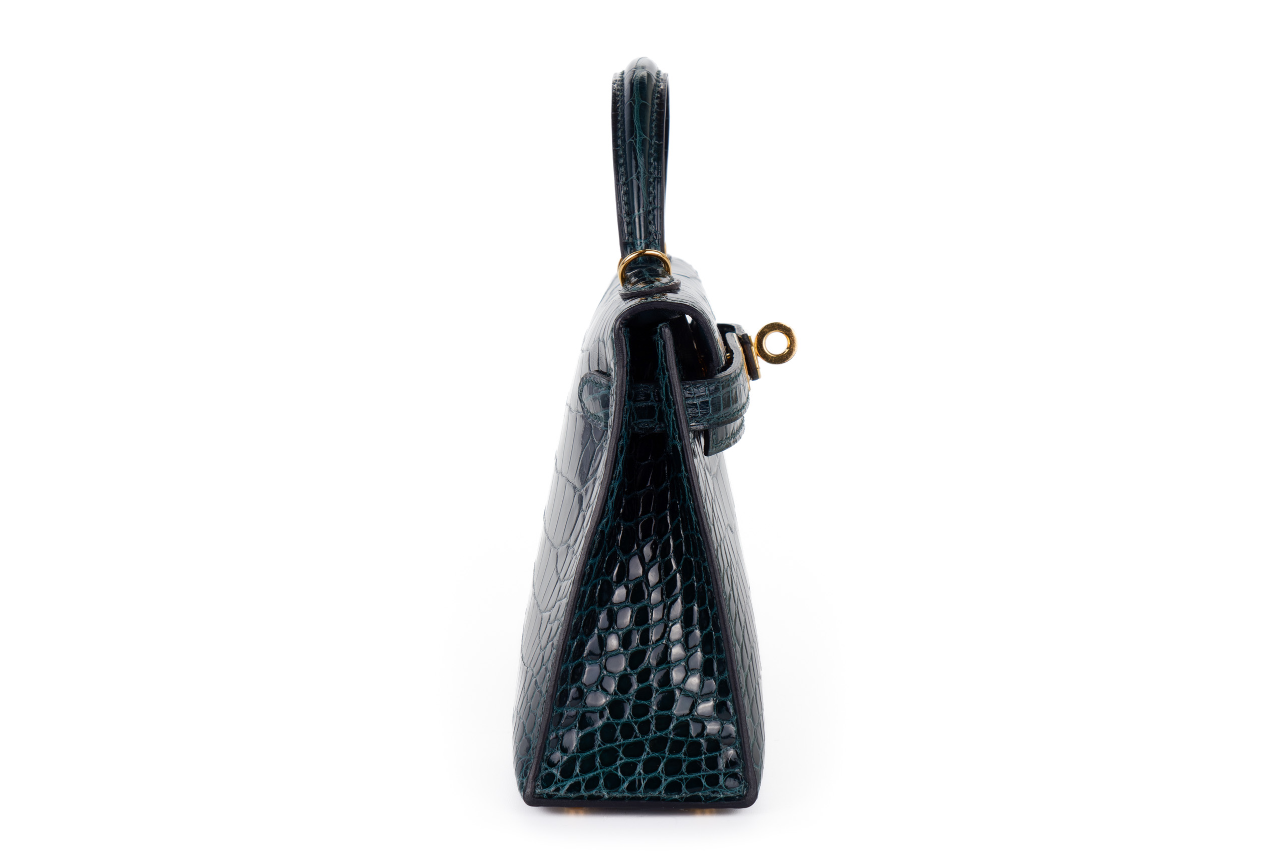 Hermès Mini Kelly Vert Cypres Shiny Alligator Gold Hardware / Excellent Pre-Loved condition D stamp 2019