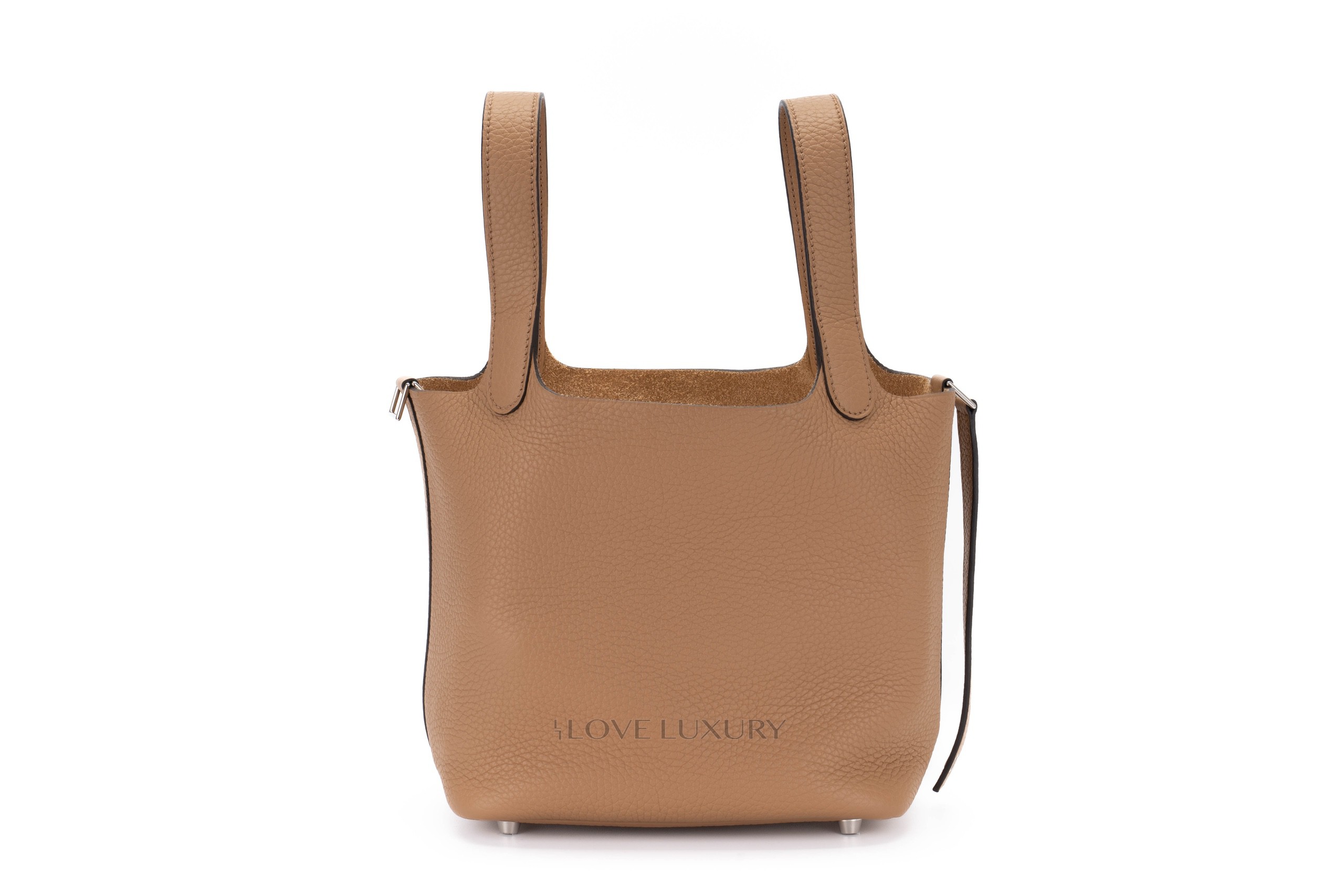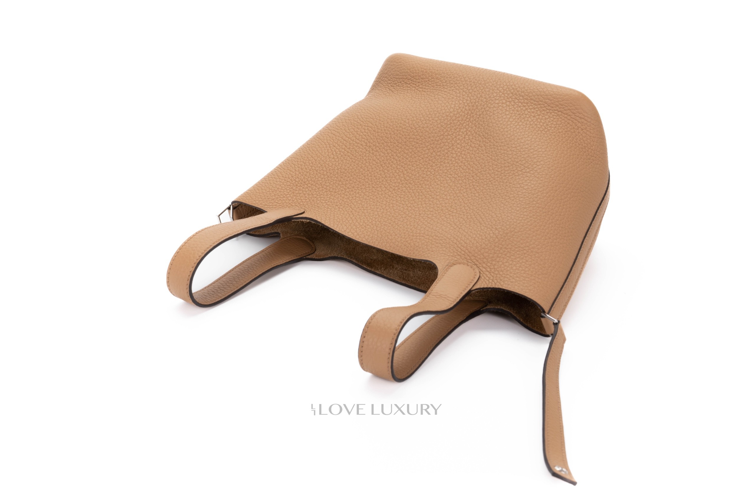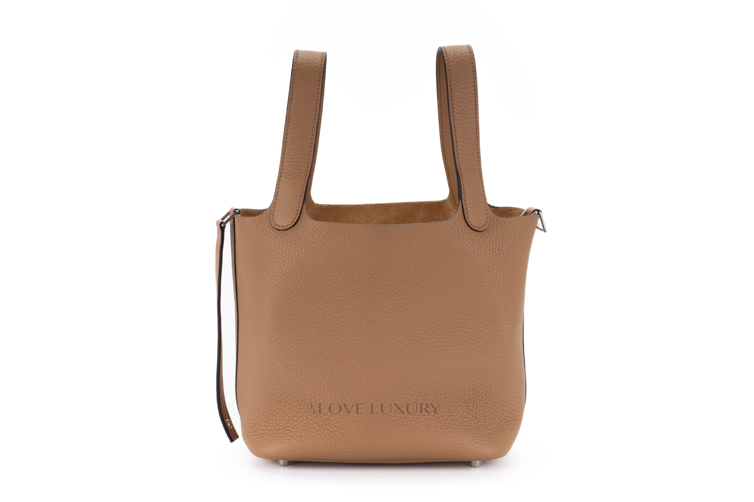 The Picotin Lock was first introduced in 2002, it is inspired by a horse feed bag. This model has a strap that secures the bag shut with the Hermès padlock. The picotin is predominately crafted from Clemence leather lending to a more casual feel. Chai is a 2022 colour reminiscent of a cup of milky tea. This particular model of Picotin Lock has palladium hardware accents. This bag has not been used however from poor storage the bag has a little slouch, however there are no signs of use. This bag comes as a full set.