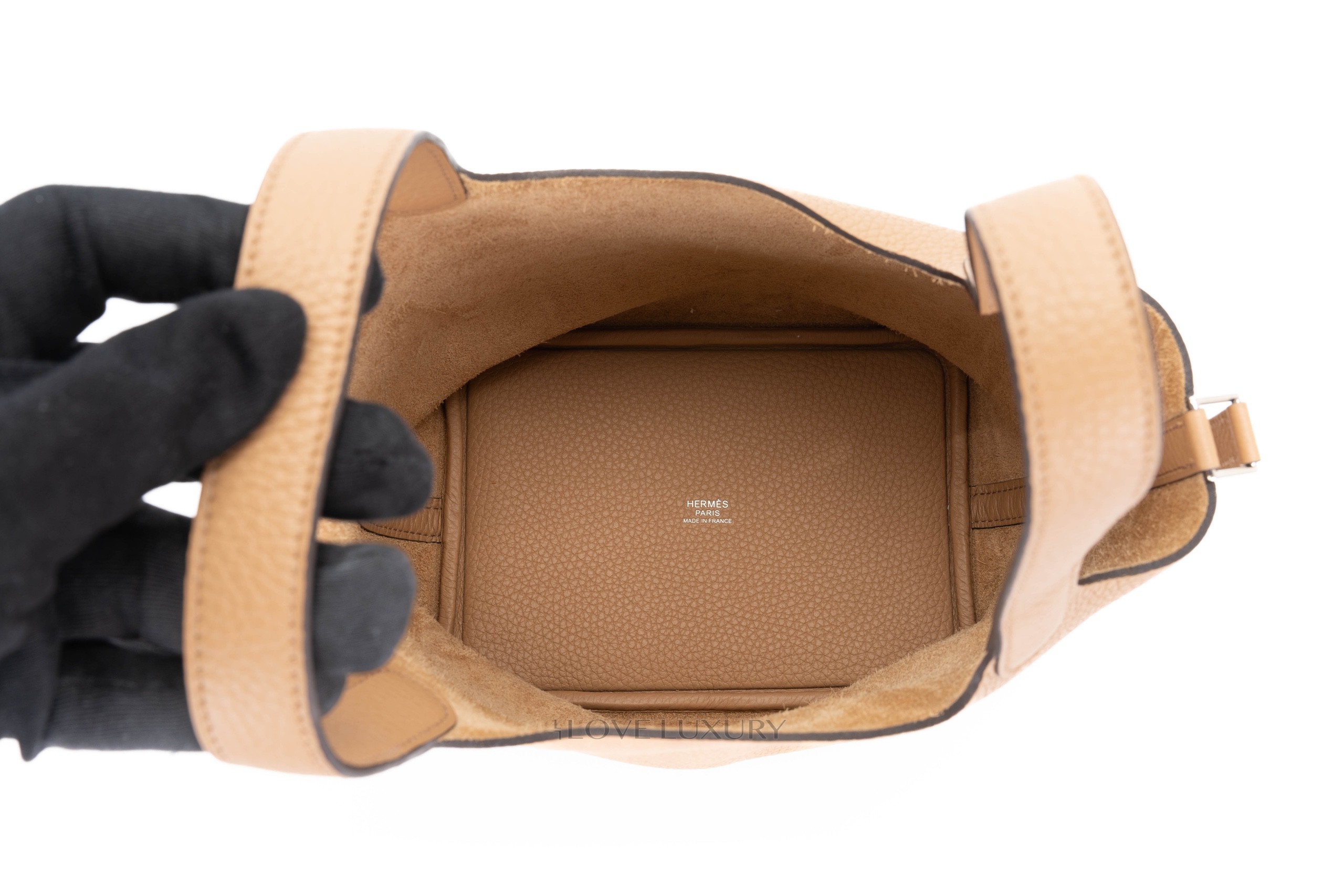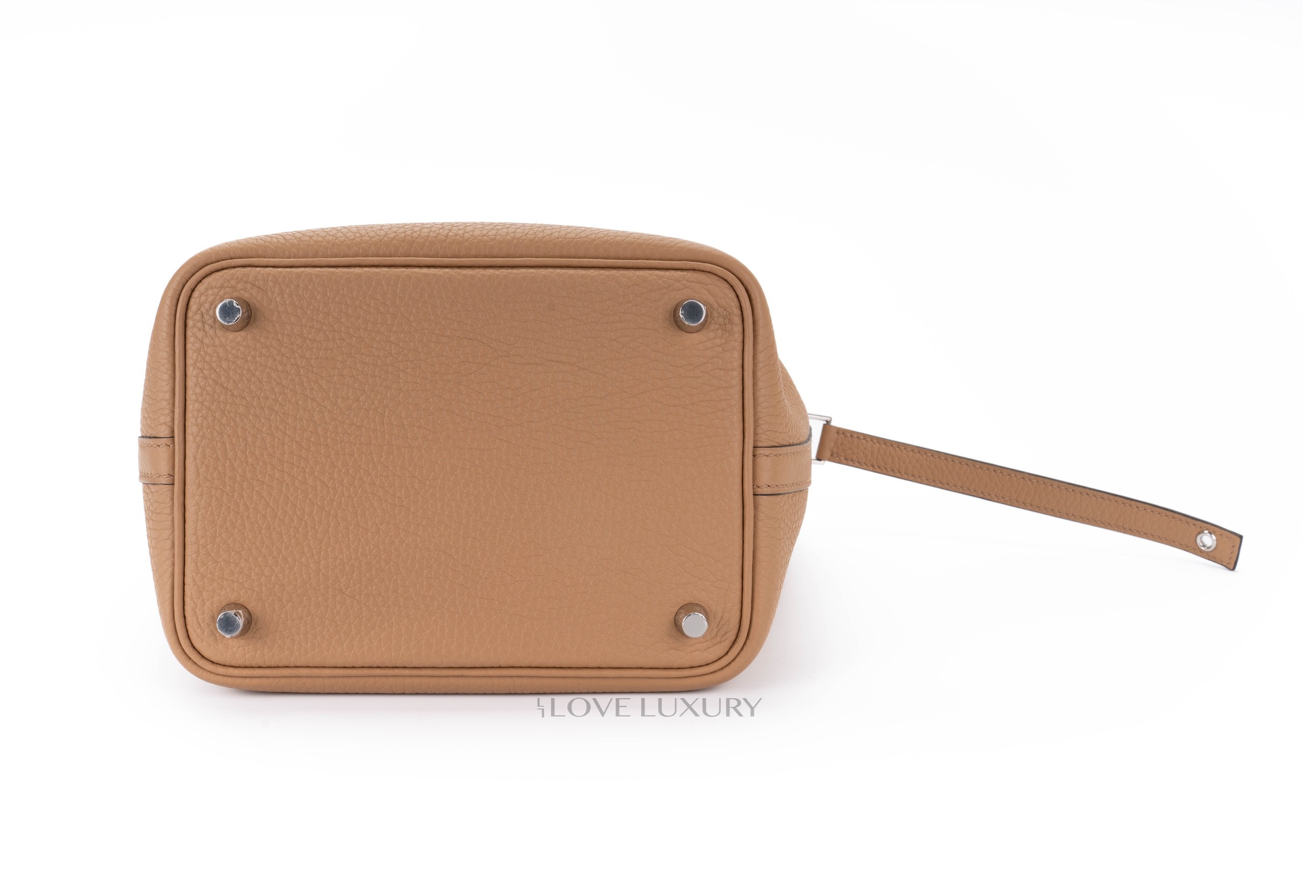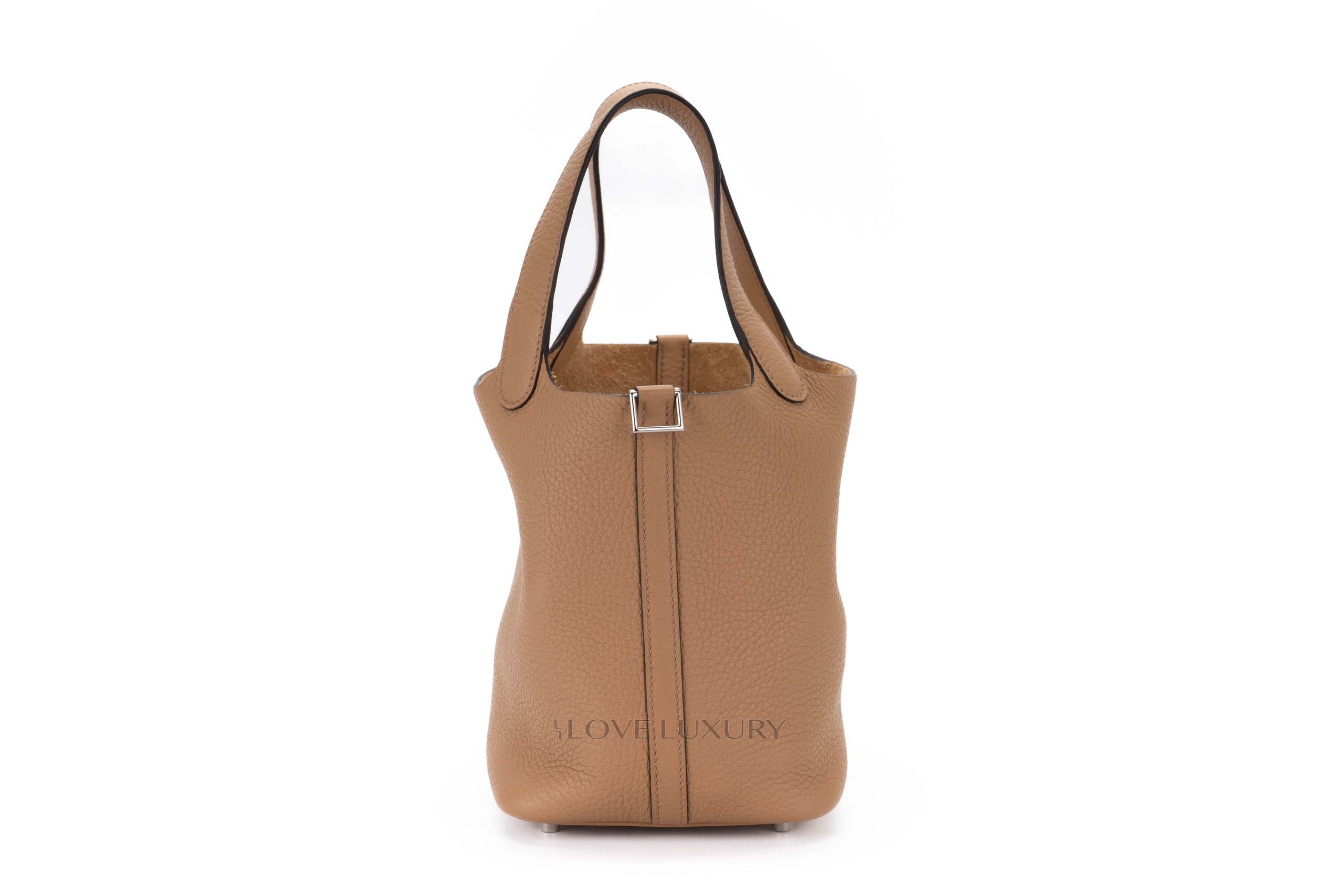 The Picotin Lock was first introduced in 2002, it is inspired by a horse feed bag. This model has a strap that secures the bag shut with the Hermès padlock. The picotin is predominately crafted from Clemence leather lending to a more casual feel. Chai is a 2022 colour reminiscent of a cup of milky tea. This particular model of Picotin Lock has palladium hardware accents. This bag has not been used however from poor storage the bag has a little slouch, however there are no signs of use. This bag comes as a full set.