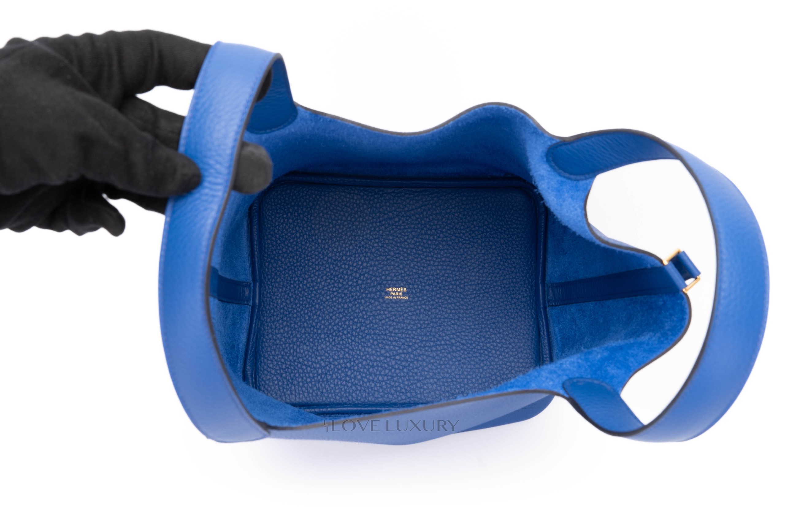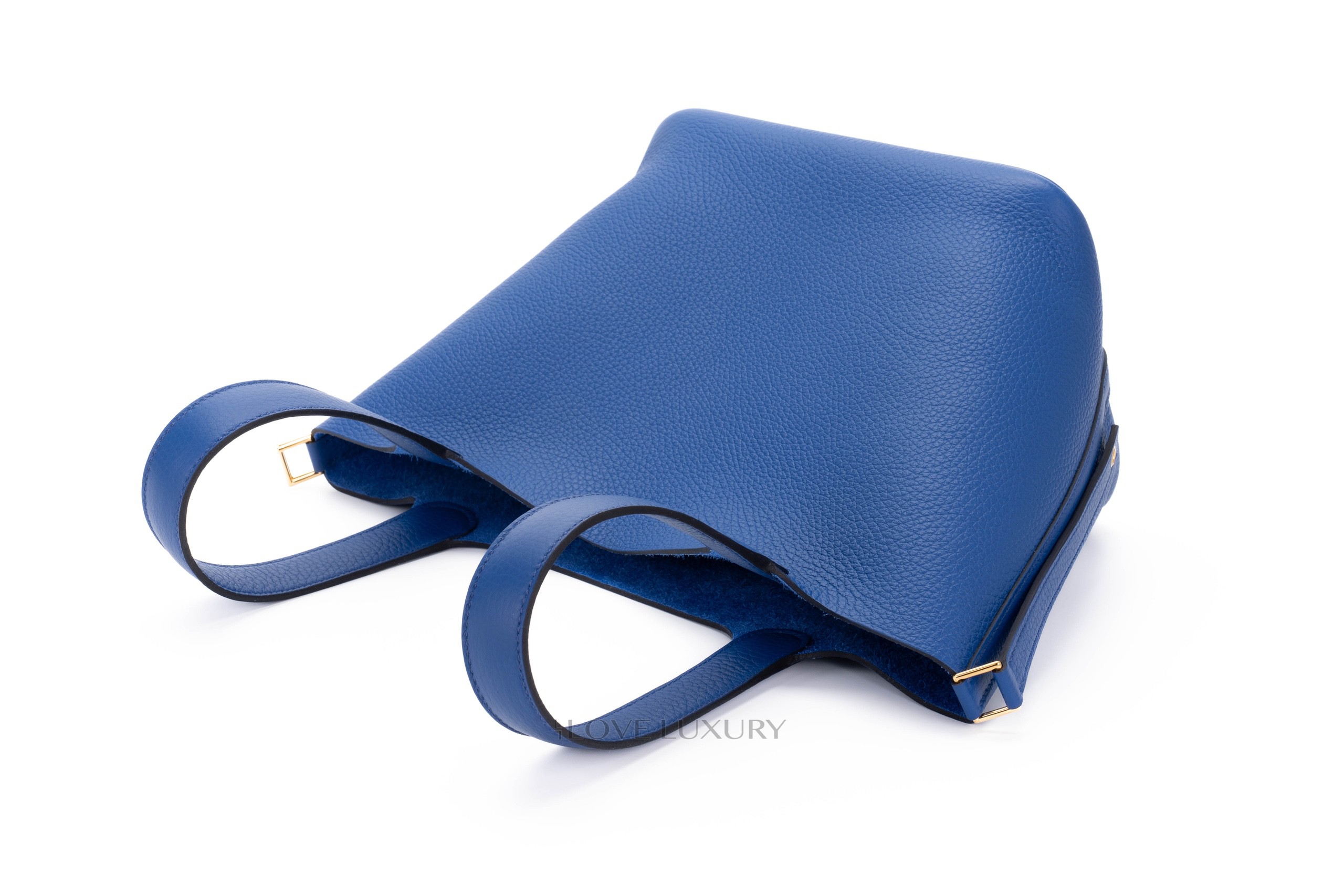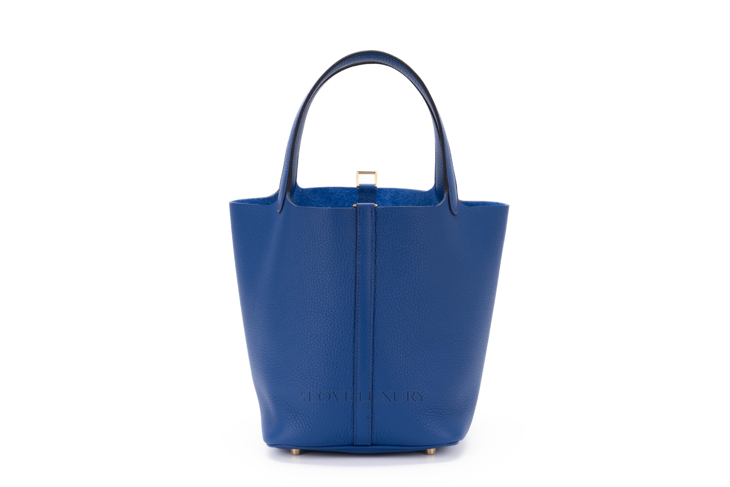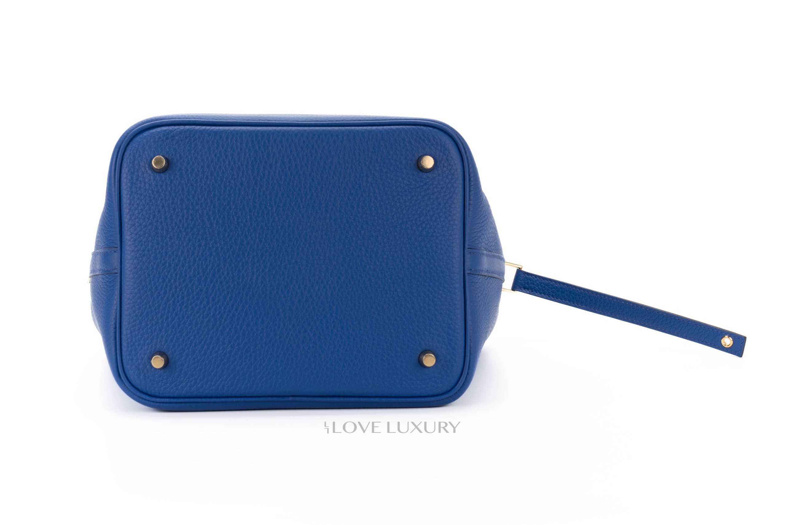 Blue Royal is a firm favourite here at Love Luxury, it really does ooze opulence and regality. The blue clemence leather is contrasted with gold hardware. This is a medium size Picotin measuring 22cm across the bottom of the bag. The Picotin lock features a strap closure which is secured with the classic Hermès padlock. This bag is box fresh and comes as a full set.