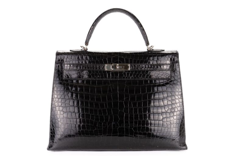 Hermès Kelly 35 Black Shiny Porosus Crocodile Palladium Hardware