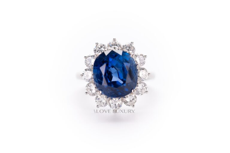 Platinum Sapphire Ring Set with One Oval Mixed Shape Natural Saphire Center Stone & 12 Round Brilliant Cut Diamonds on the side
