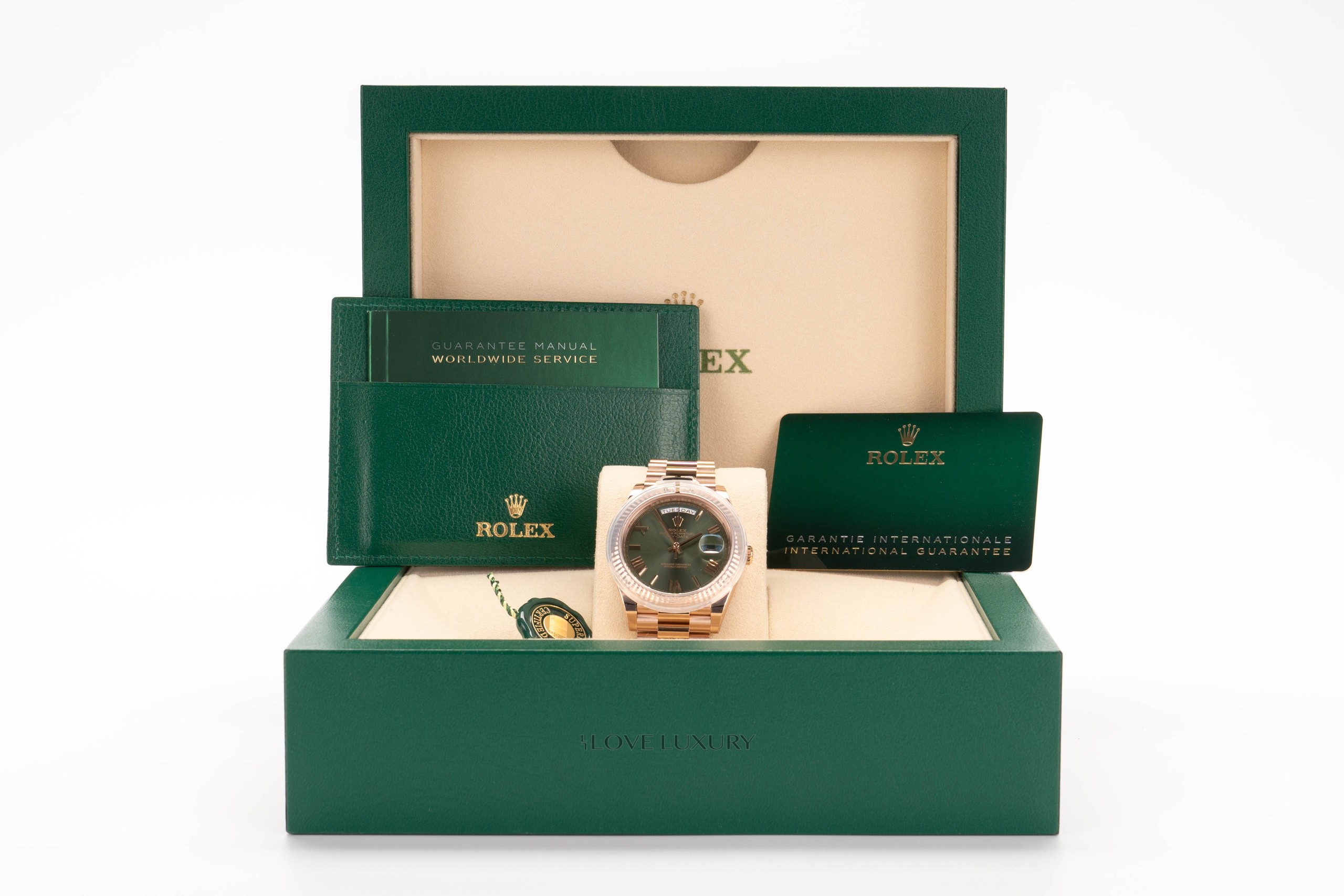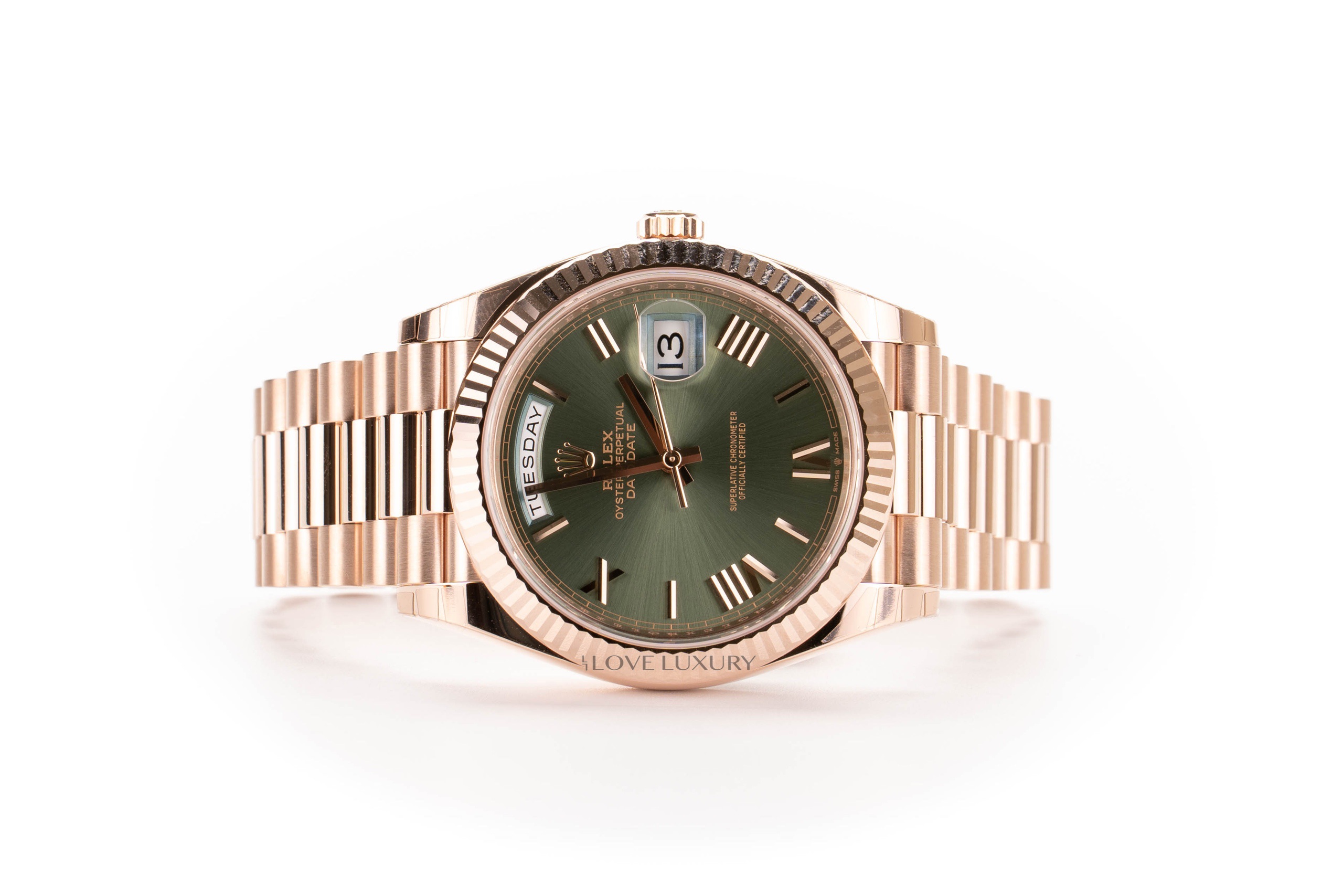 Rolex Rose Gold Day-Date 40mm Olive Green Anniversary Dial – ref 228235