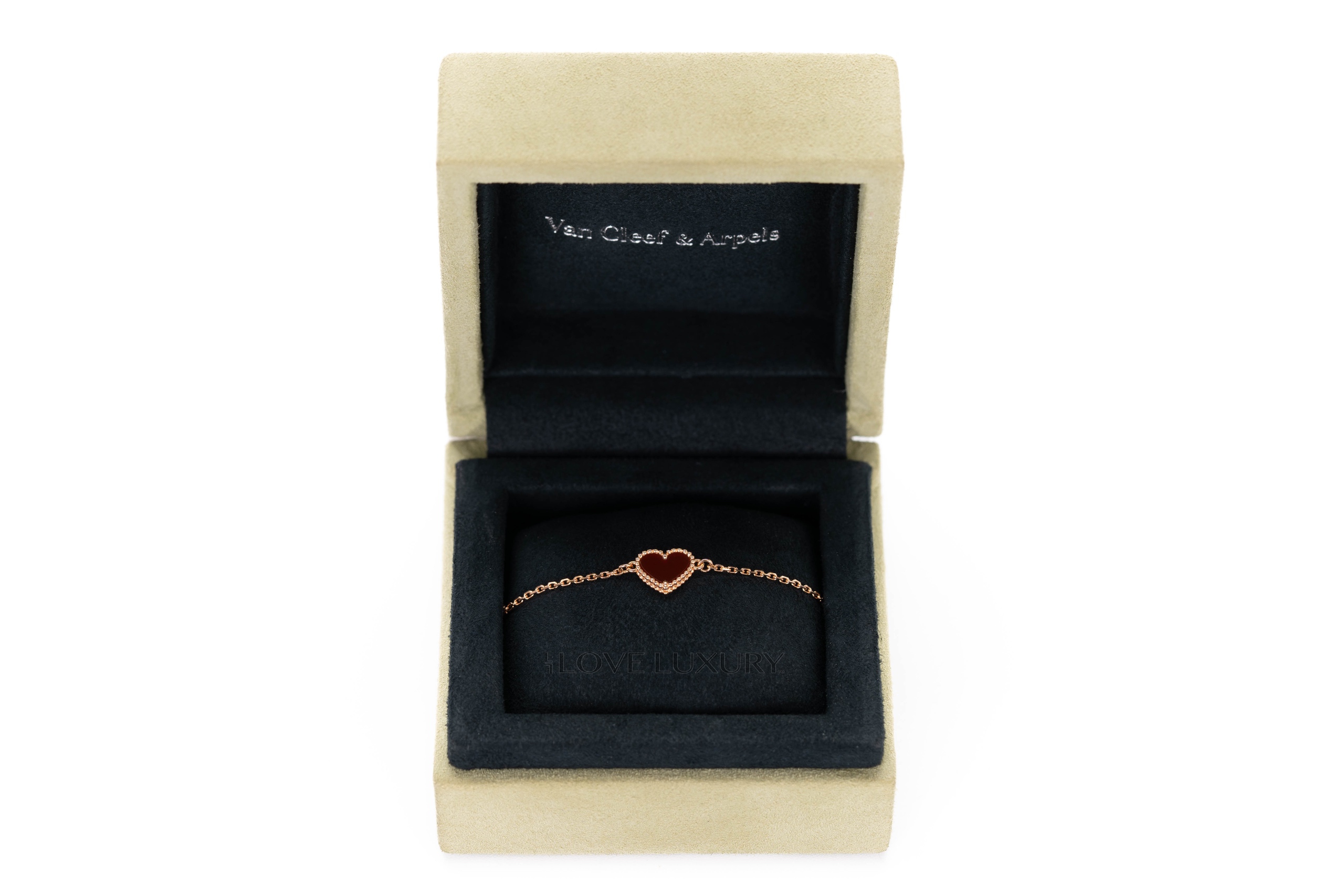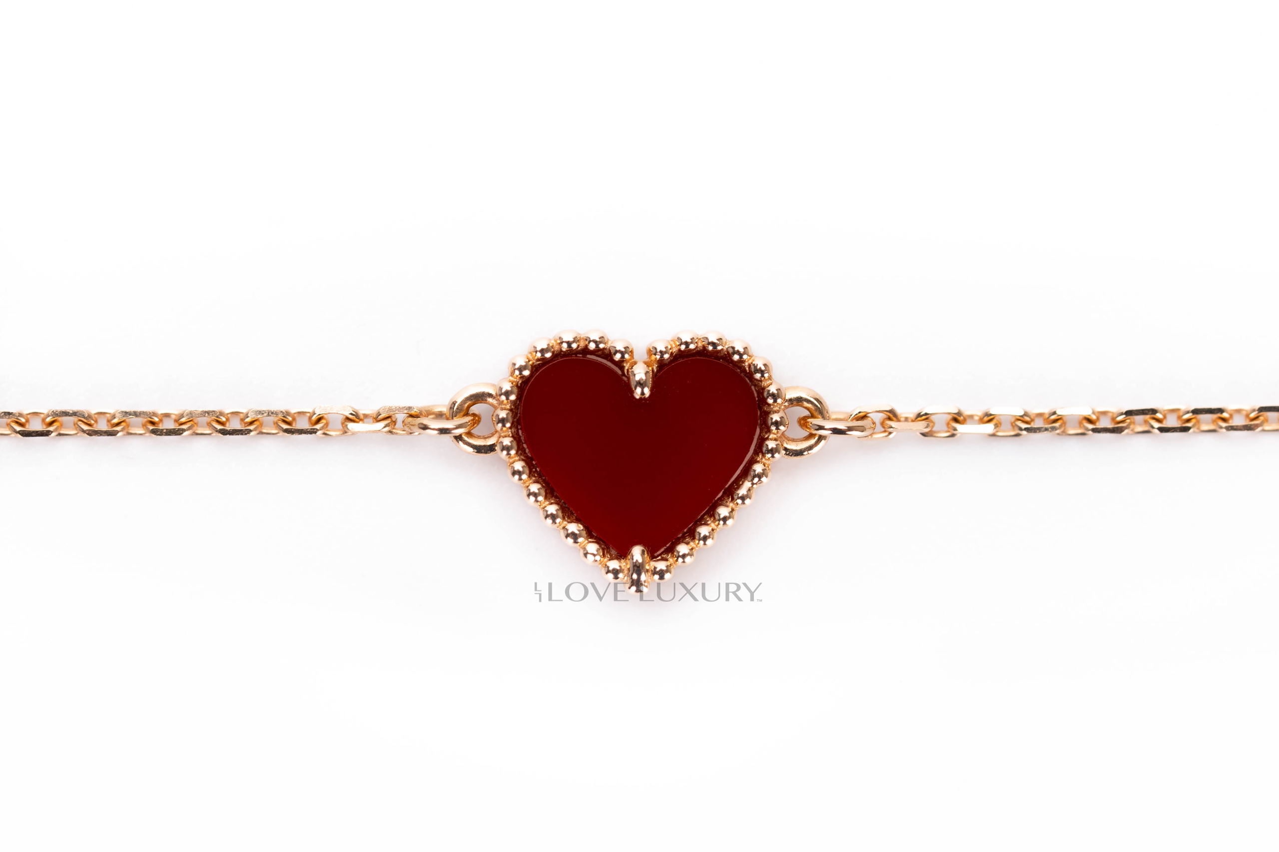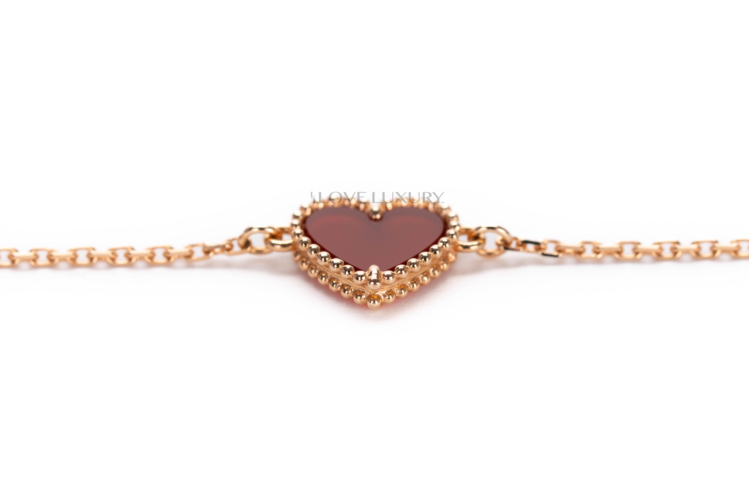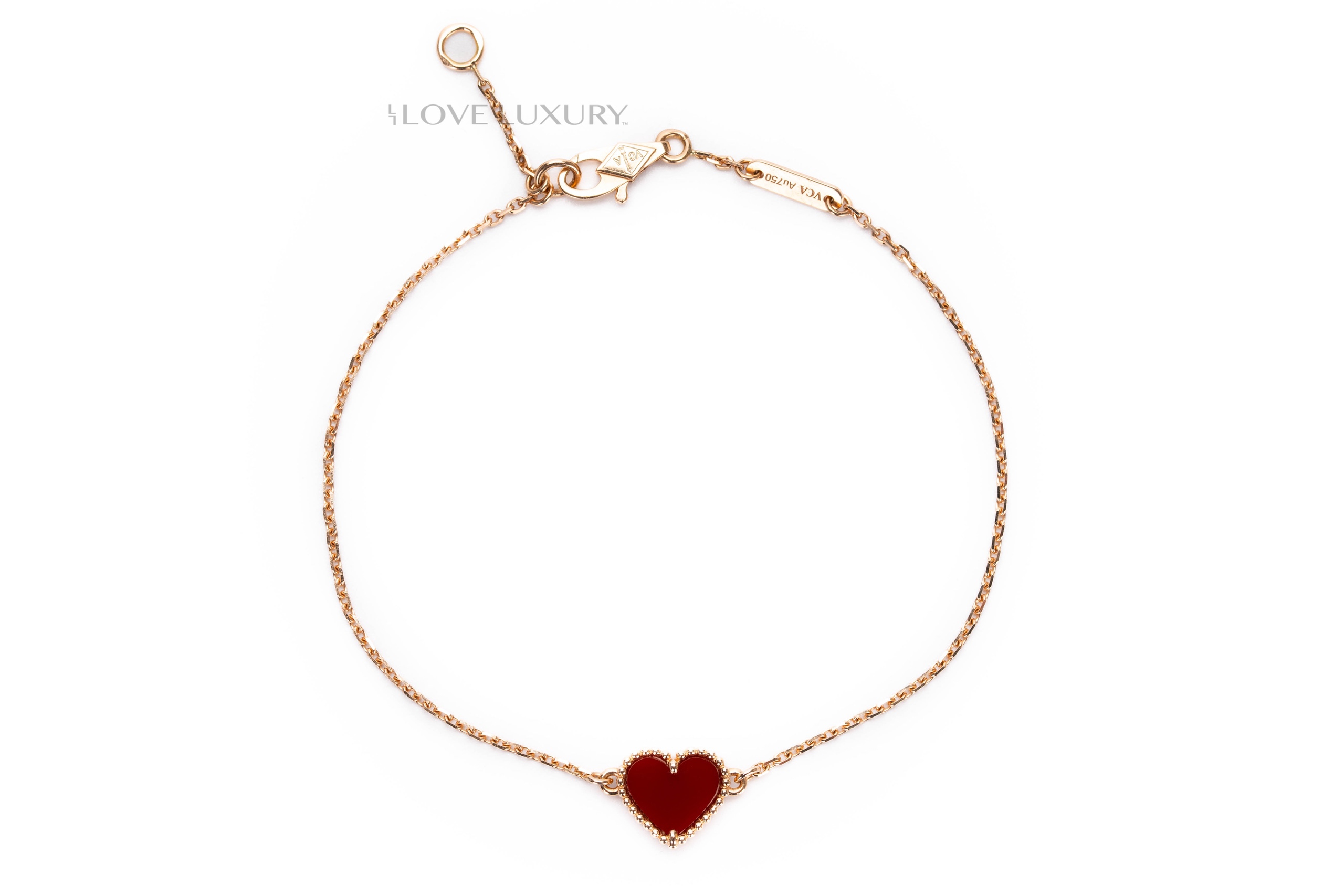 Van Cleef & Arpels are the height of fashion and worn by celebrities around the world such as Adele and LeBron James. This particular model of Van Cleef & Arpels is the sweet heart carnelian stone which is a semi opaque red stone. This item is in a preloved condition and comes as a full set including receipt.