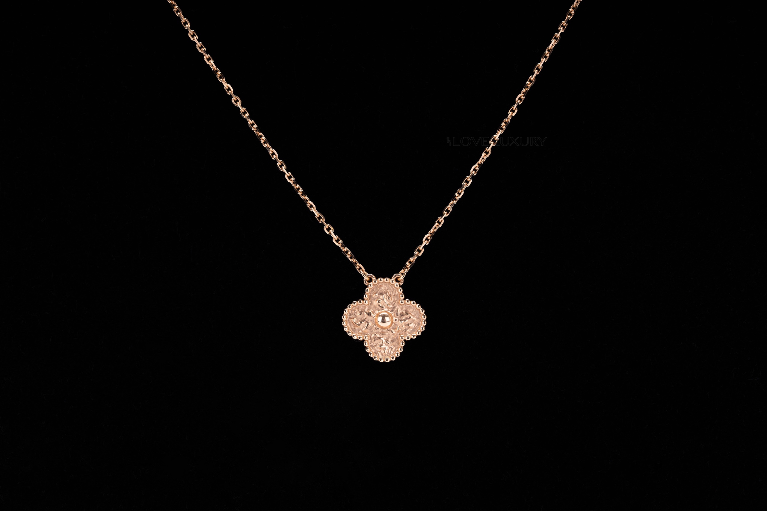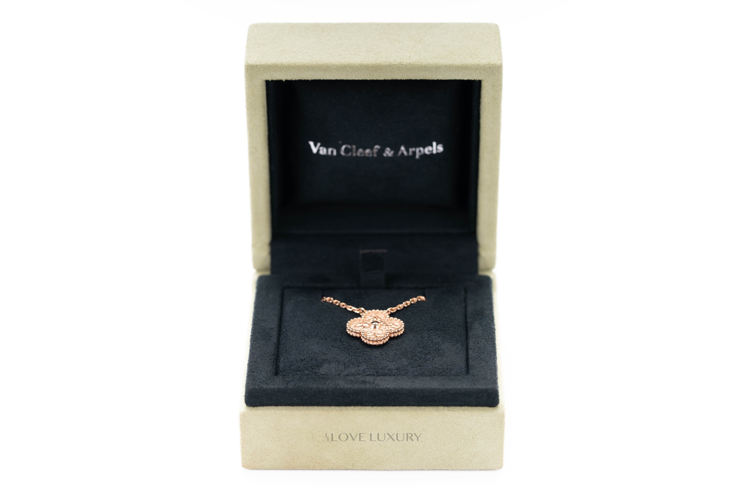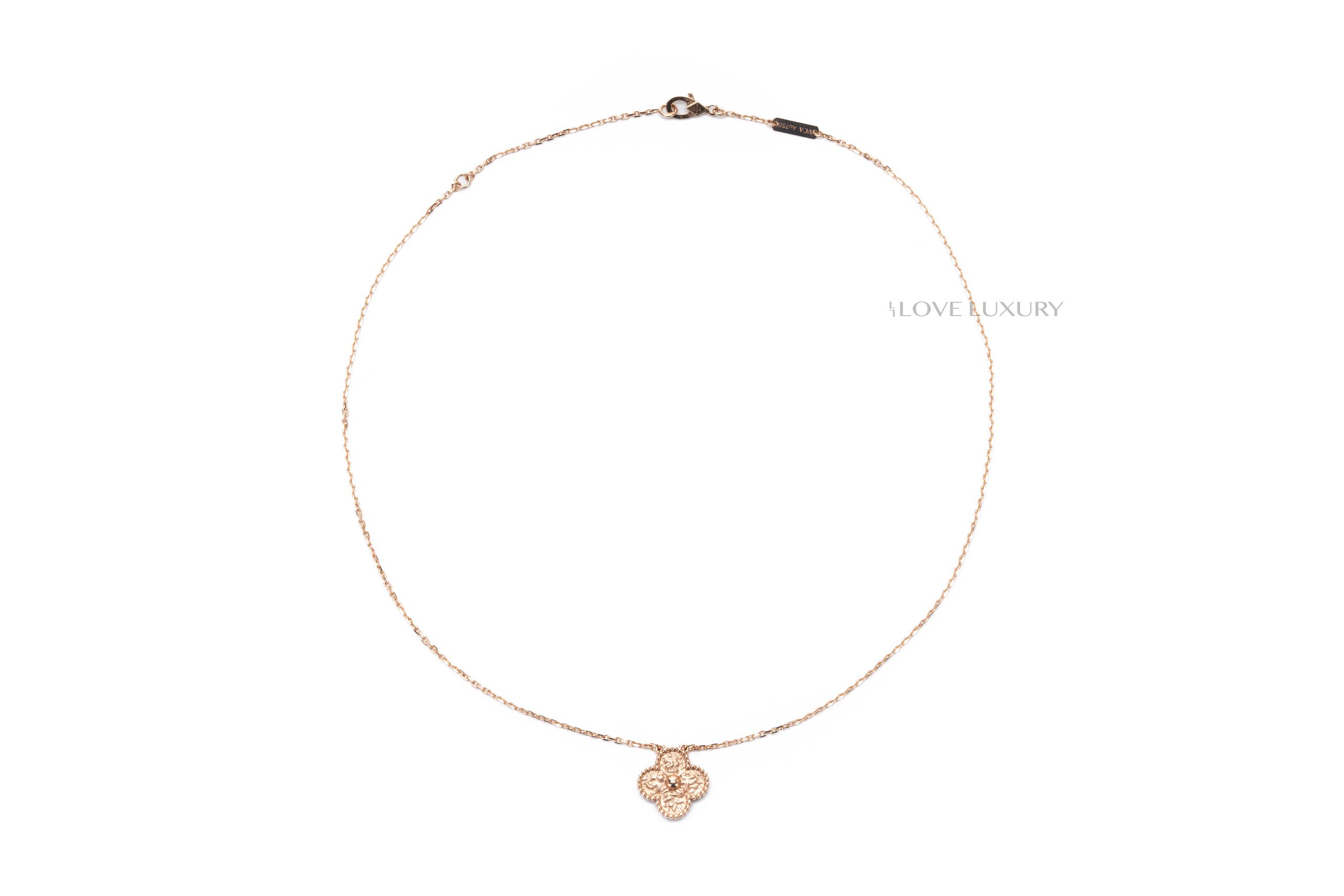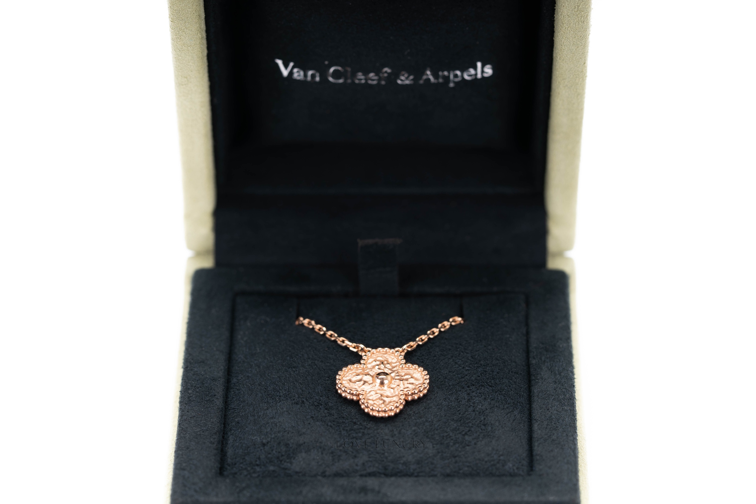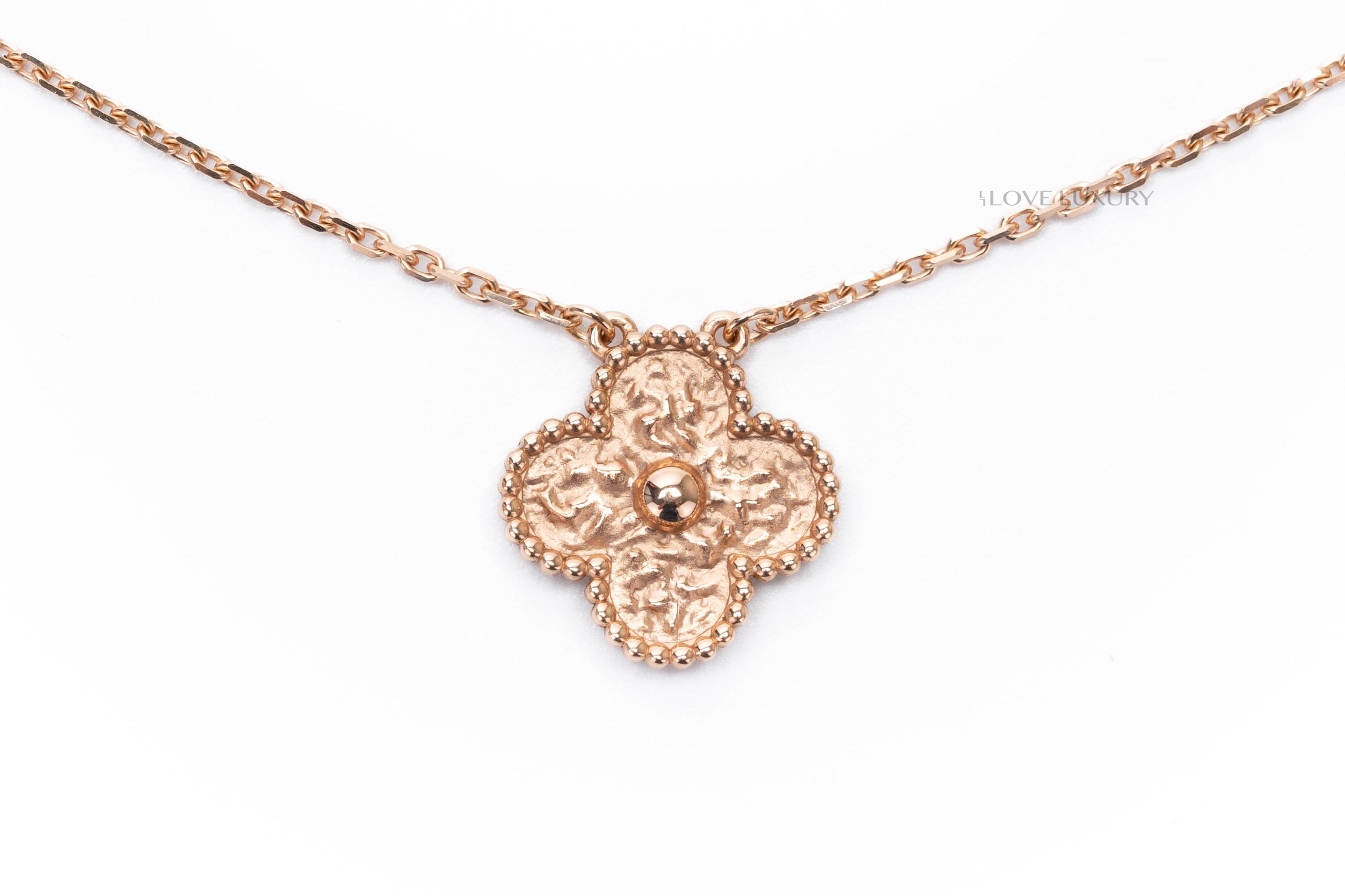 The Vintage Alhambra Van CLeef & Arpels necklace is absolutely stunning in hammered rose gold. This solid 18k rose gold pendant and chain can be worn day in day out without having to remove like the other VCA sets, this is becuase there are no stones in this piece as it is simply hammered 28k gold. The hammered alhambra cloiver is set in the perlee casing which is tiny gold beads that add to the charm and sophistication of this piece. This item is brand new and comes as a full set.