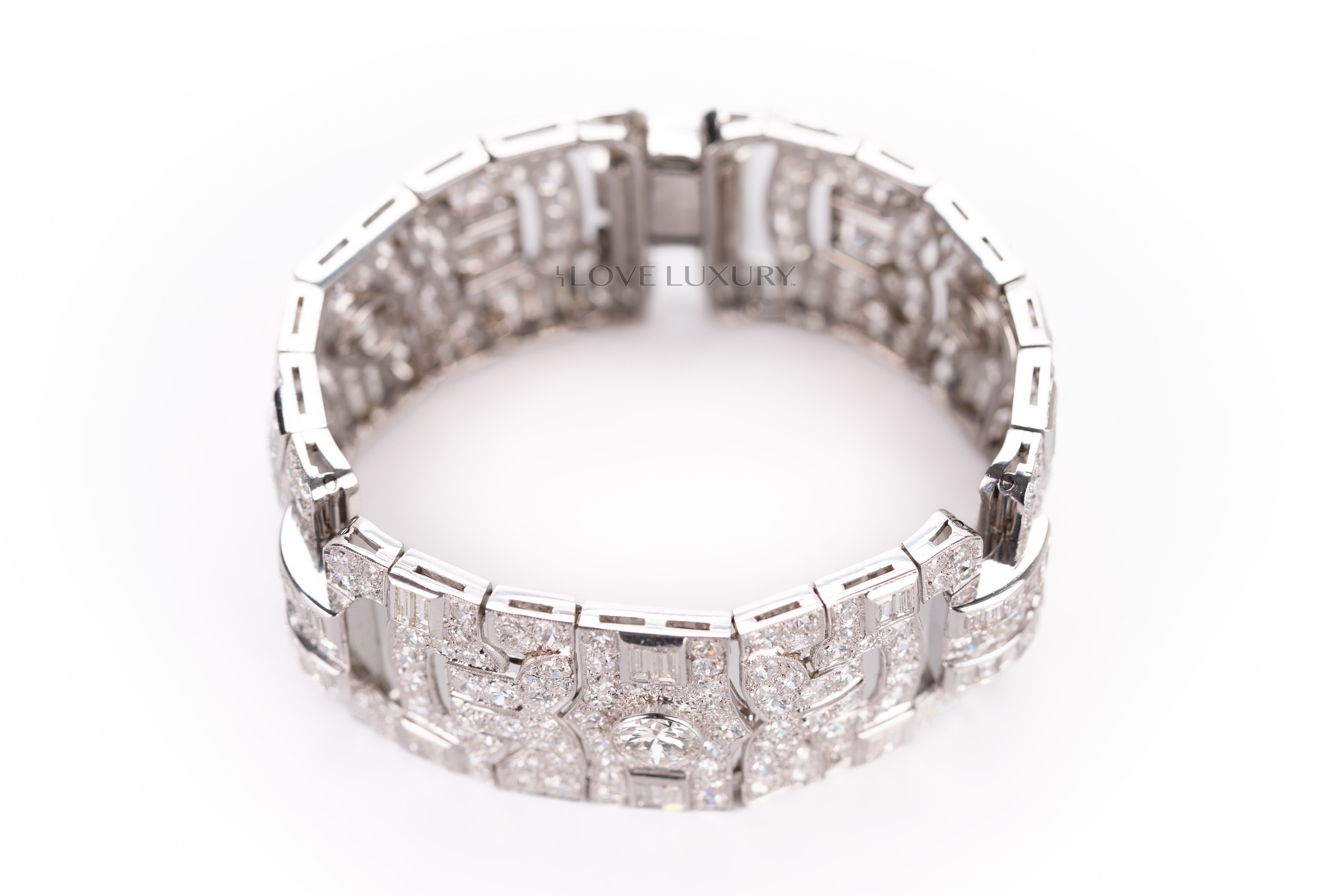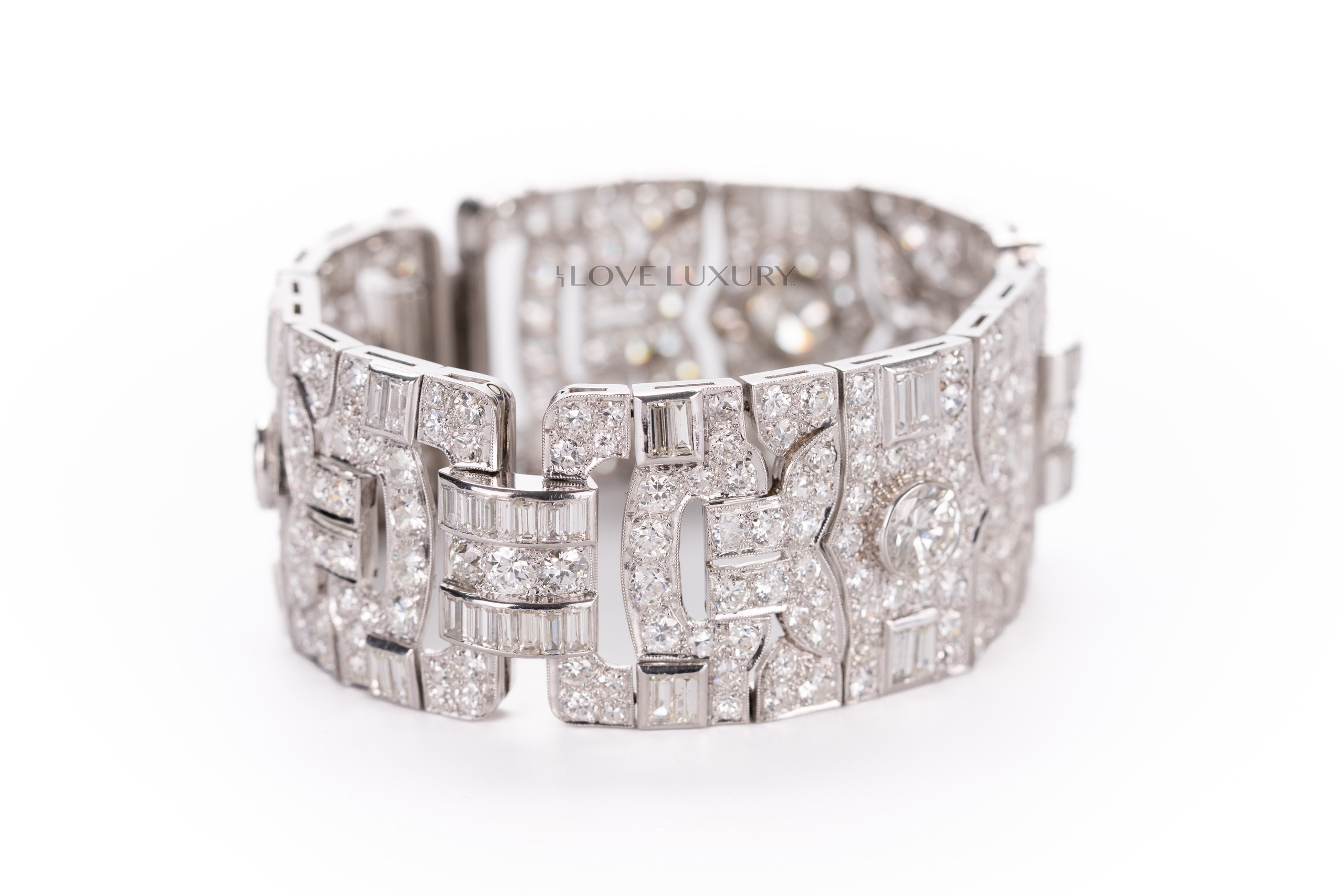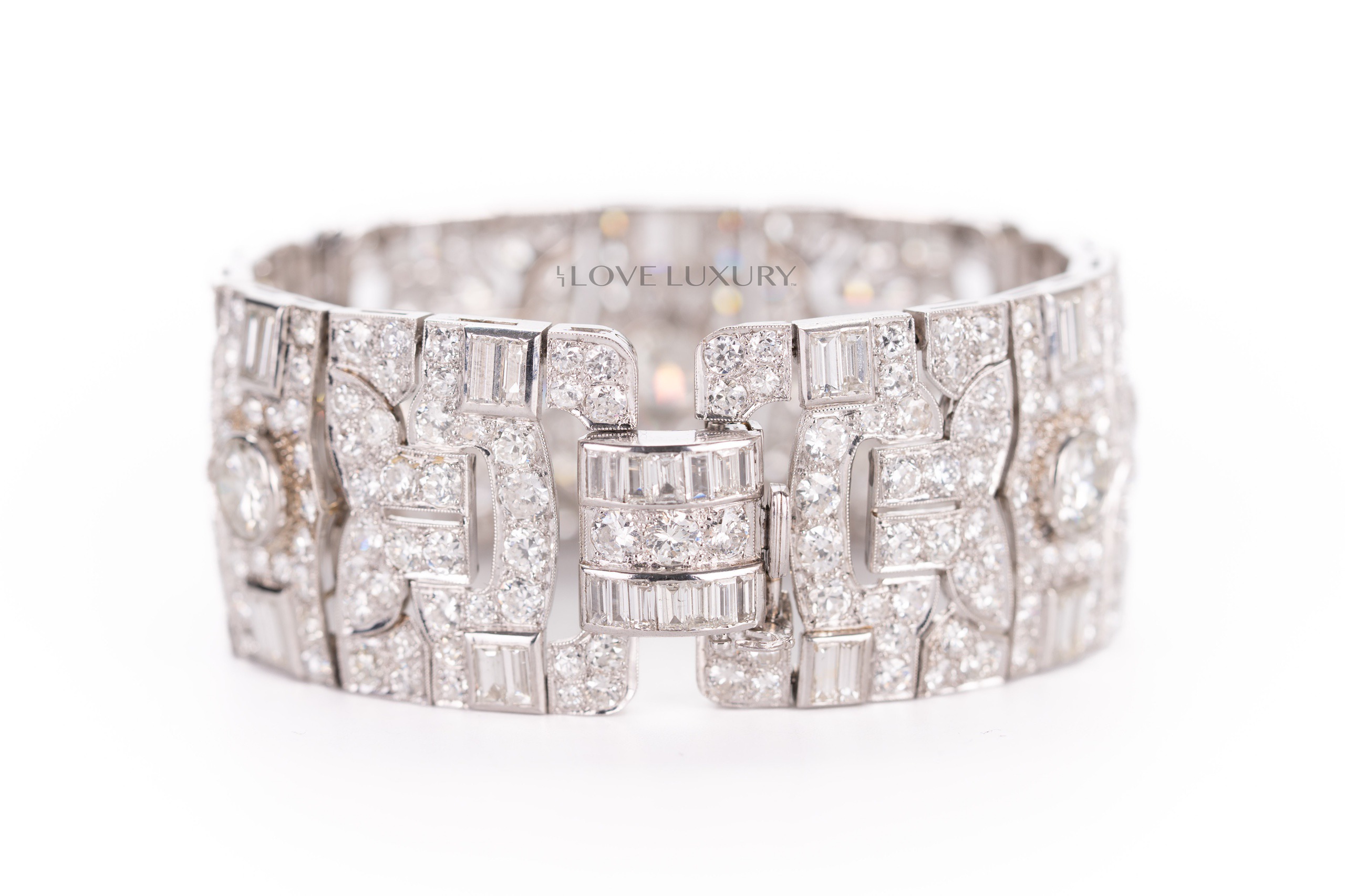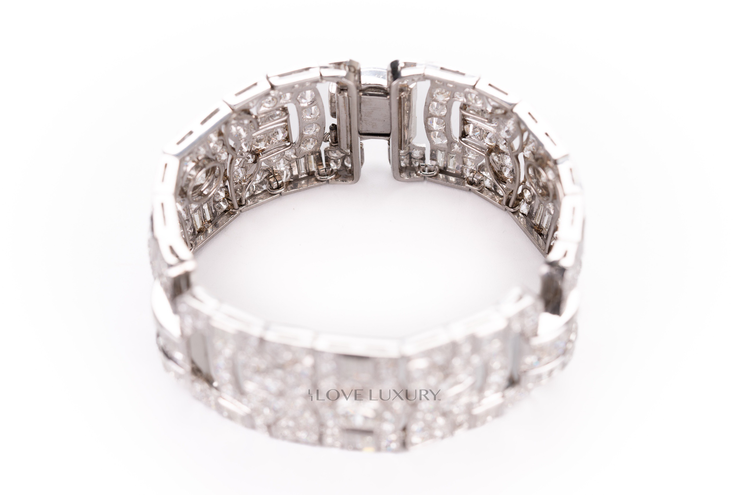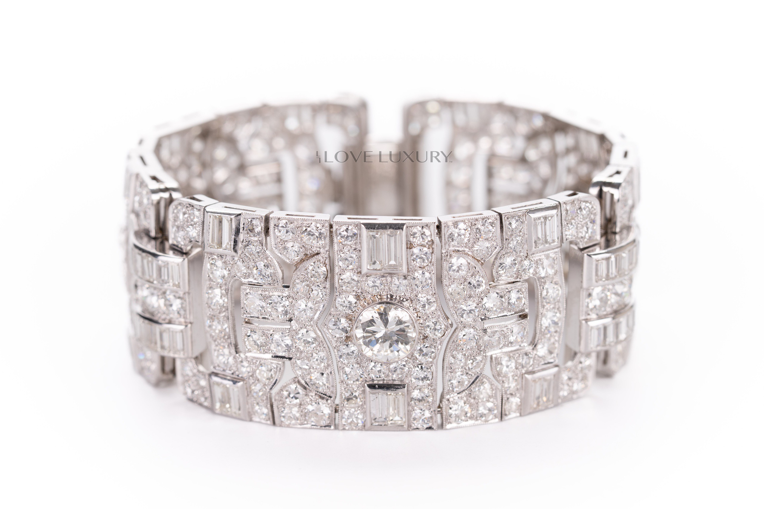 White Gold Bracelet Set with 3 Modified Round & Round Brilliant Cut Center Diamonds & 78 Baugeutte & Taper Baguette Cut 4.96 carat & 300 Modified Round & Round Brilliant Cut 29.45 carat Diamonds on the side